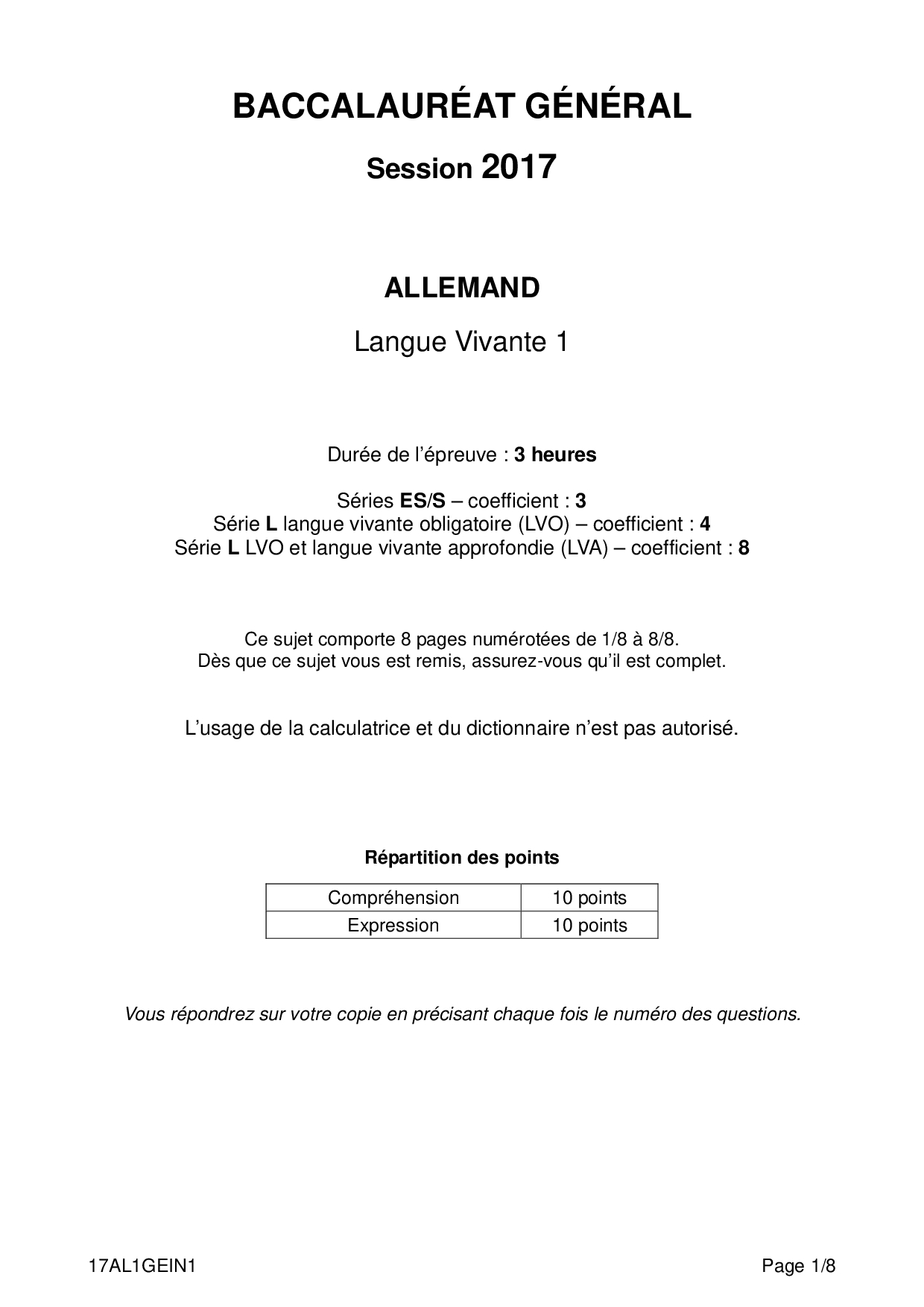 Bac S-ES-L Allemand LV1 Pondichéry 2017 - Sujet