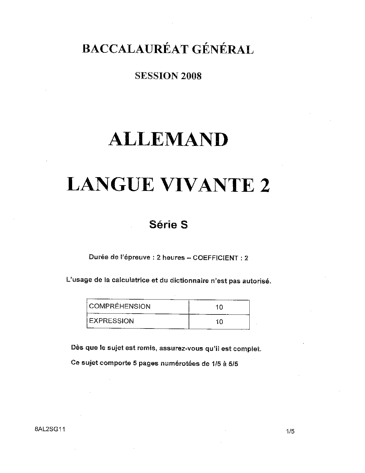Bac S Allemand LV2 Centres Etrangers Afrique 2008 - Sujet