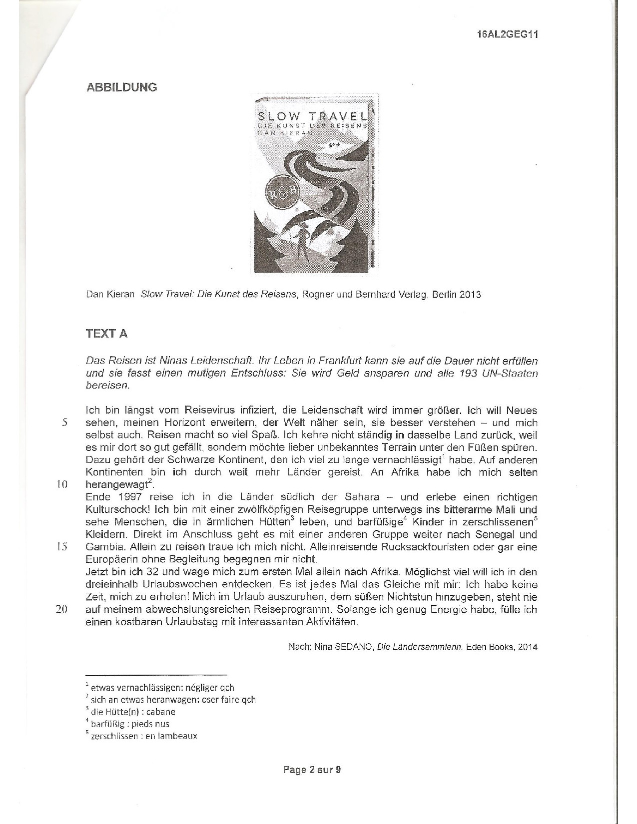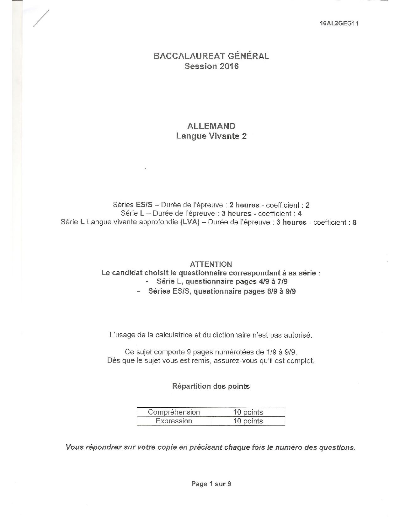 Bac S-ES-L Allemand LV2 Centres Etrangers Afrique 2016 - Sujet