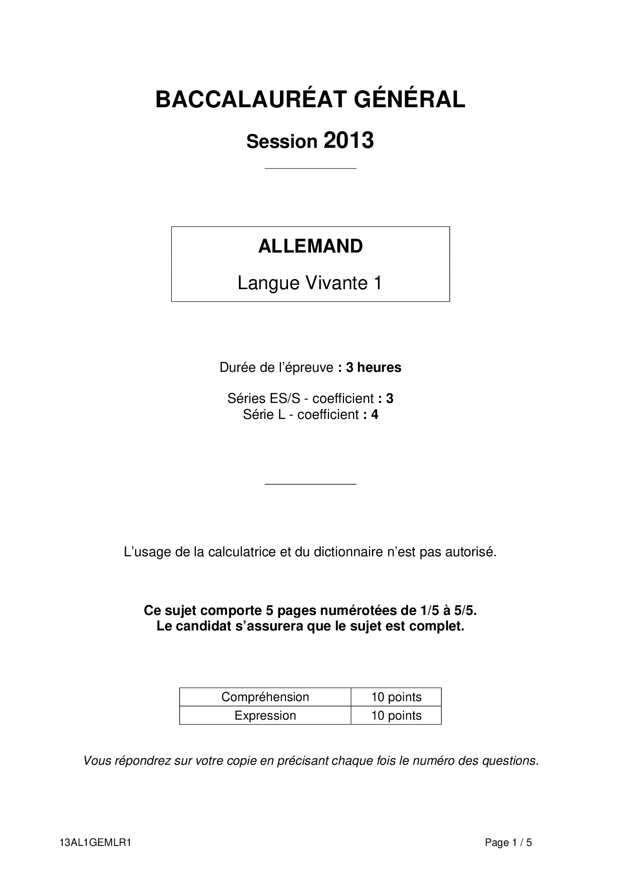 Bac S-ES-L Allemand LV1 Métropole 2013 - Sujet