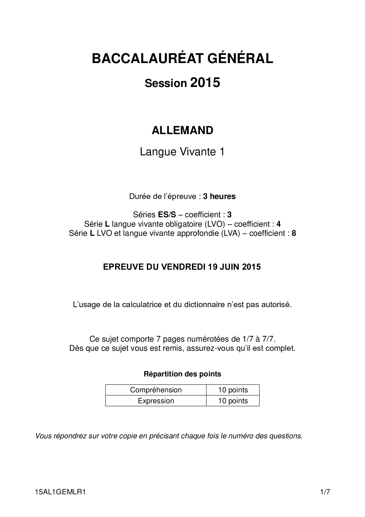 Bac S-ES-L Allemand LV1 Métropole 2015 - Sujet