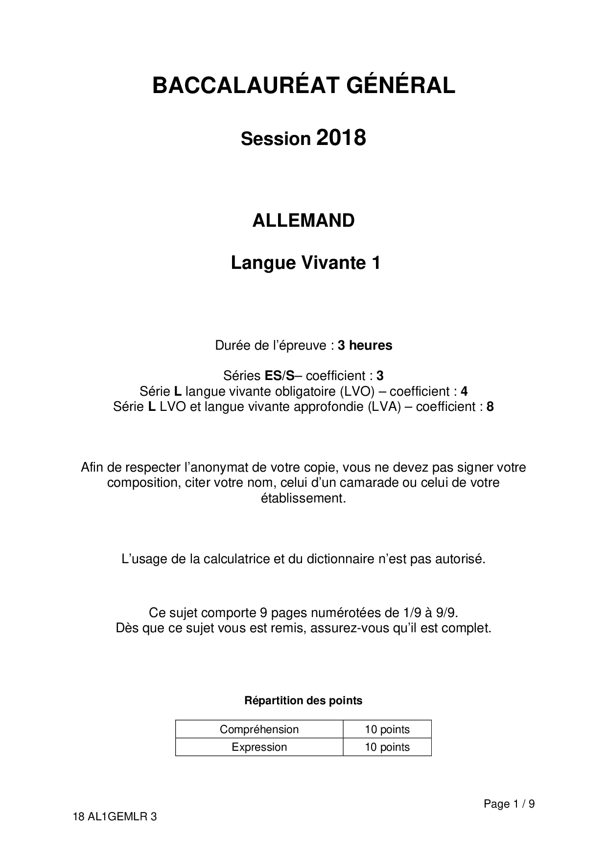 Bac S-ES-L Allemand LV1 Métropole 2018 (Session de remplacement) - Sujet