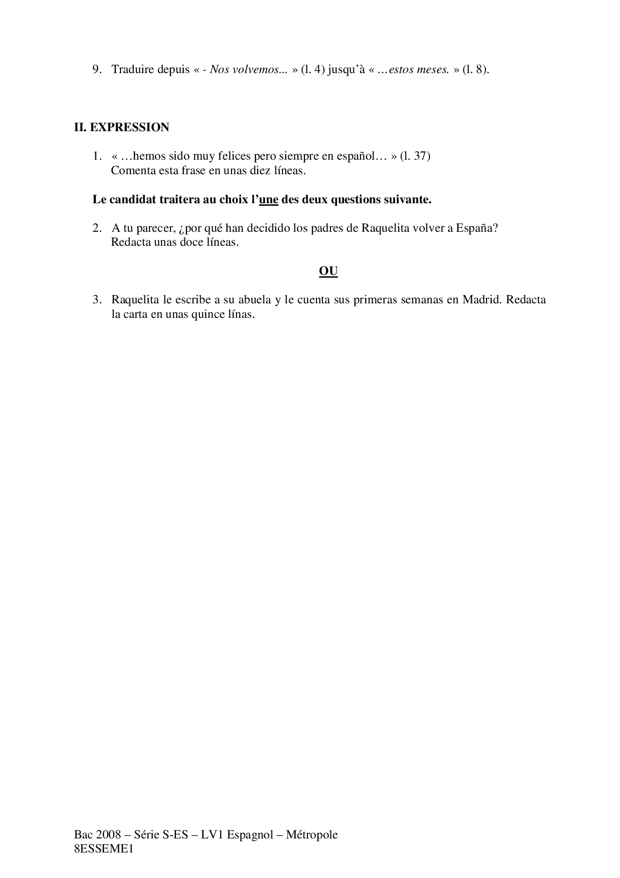 Bac S-ES Espagnol LV1 Métropole 2008 - Sujet