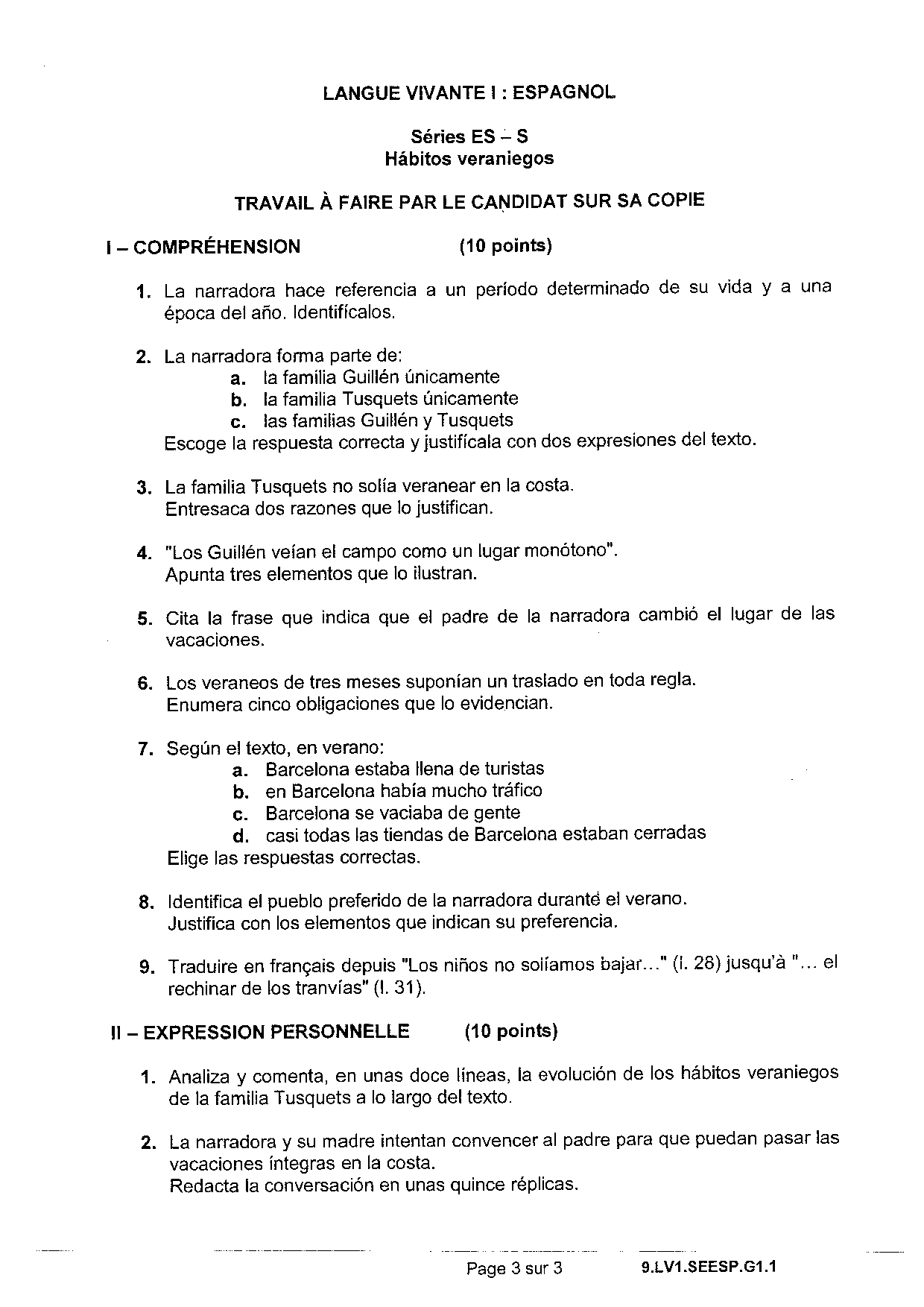 Bac S-ES Espagnol LV1 Centres Etrangers Afrique 2009 - Sujet