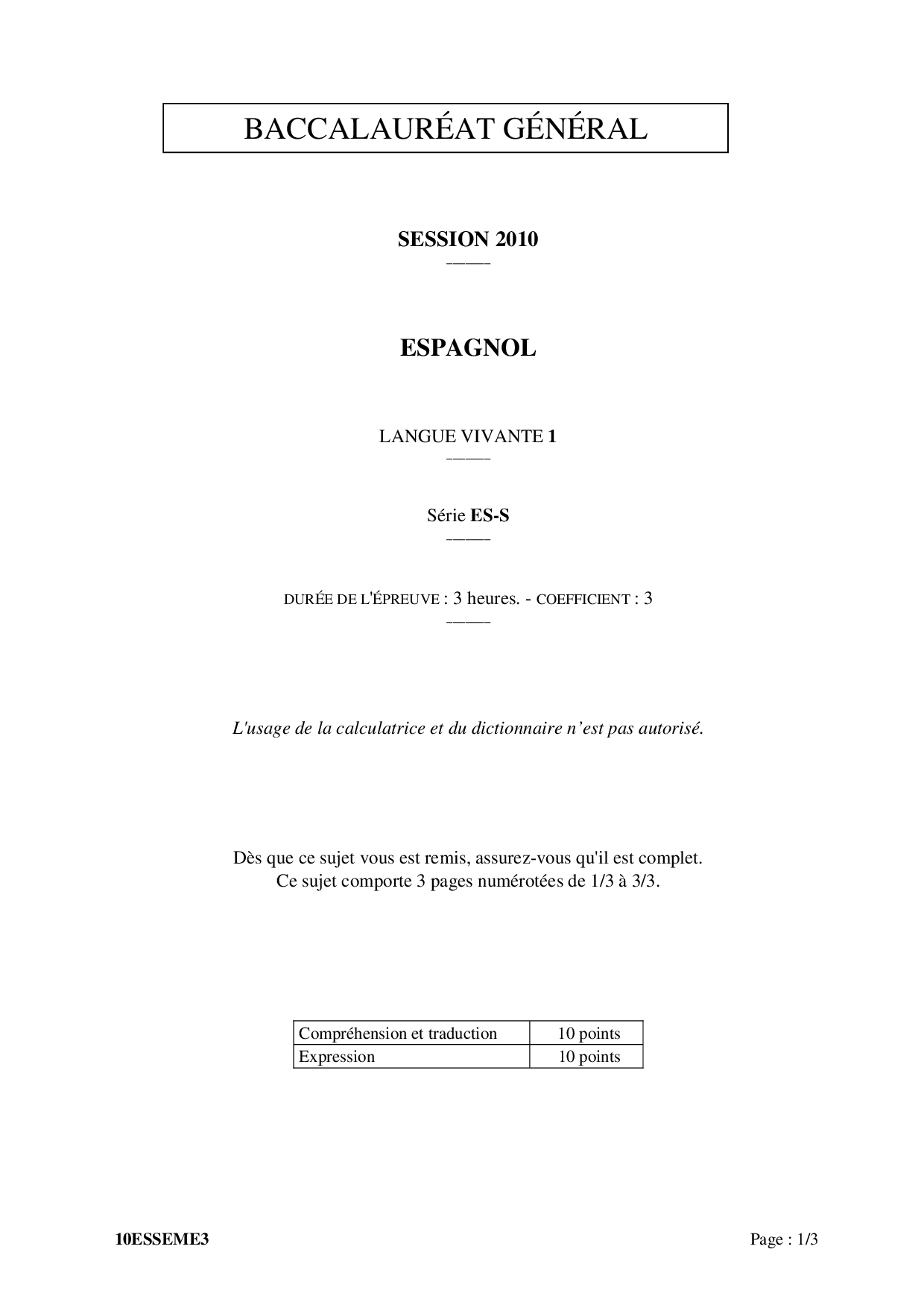 Bac S-ES Espagnol LV1 Métropole 2010 (Session de remplacement) - Sujet