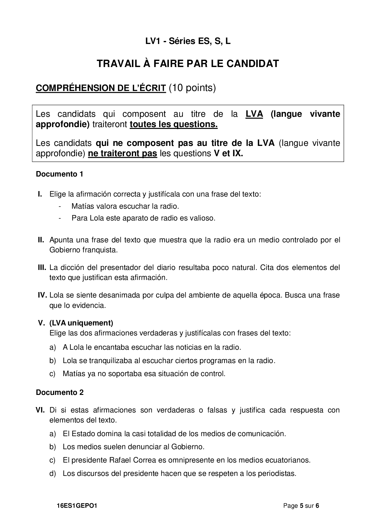 Bac S-ES-L Espagnol LV1 Polynésie 2016 - Sujet
