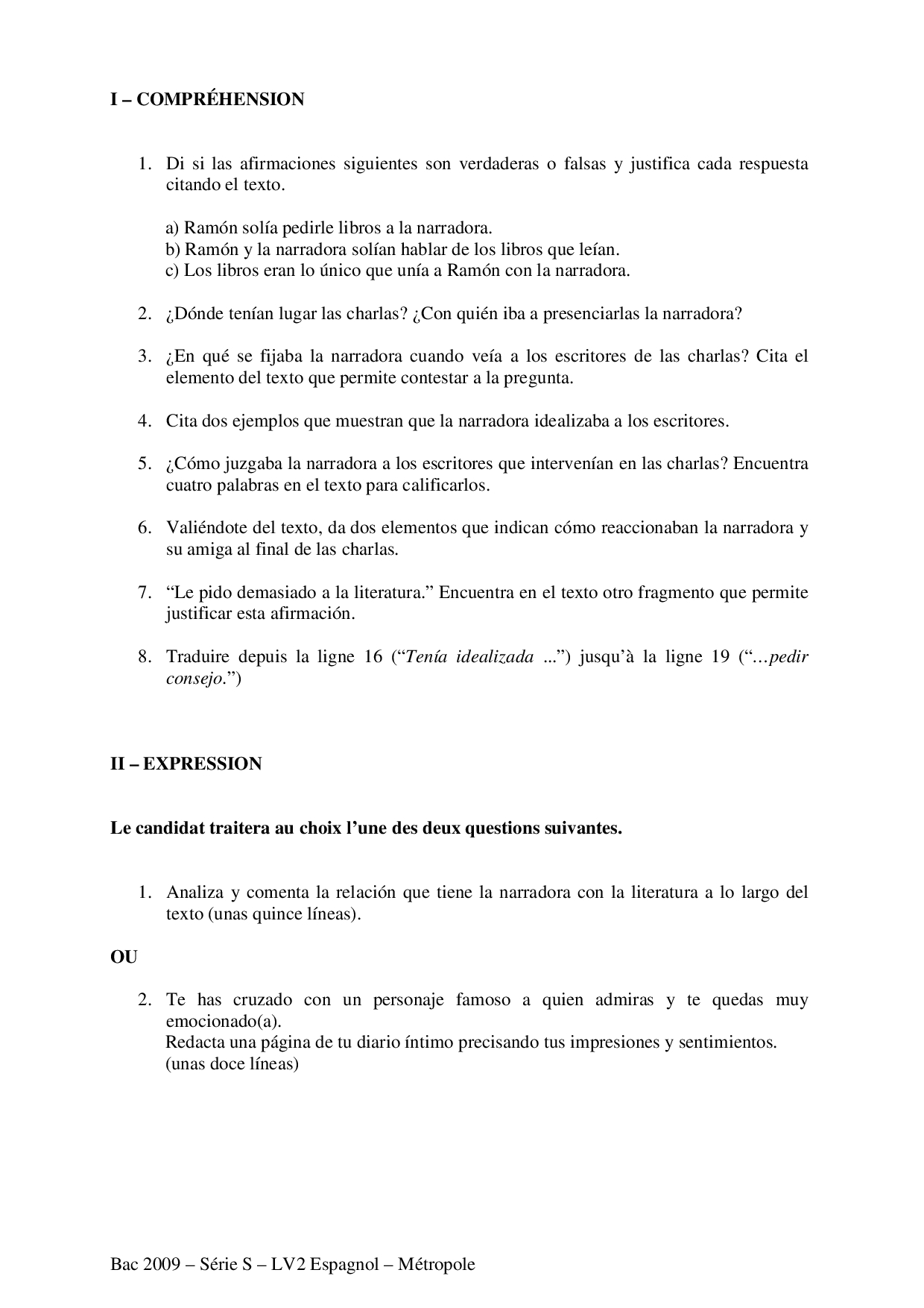 Bac S Espagnol LV2 Métropole 2009 - Sujet