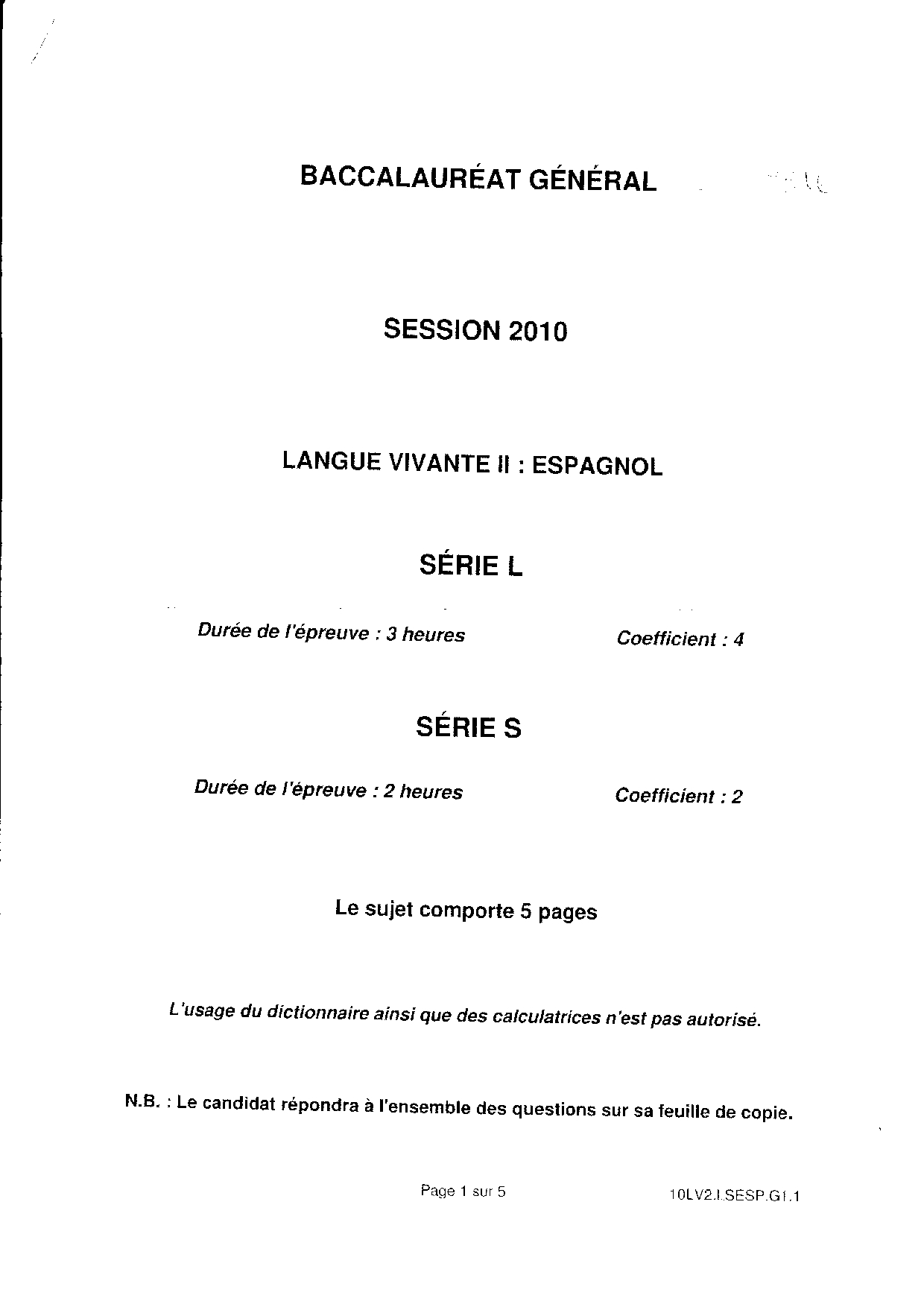 Bac S Espagnol LV2 Centres Etrangers Afrique 2010 - Sujet