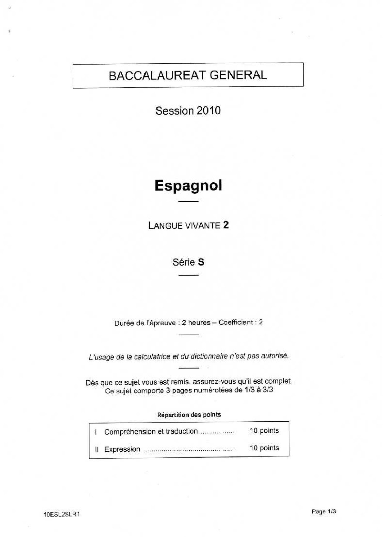 Bac S Espagnol LV2 La Réunion 2010 - Sujet