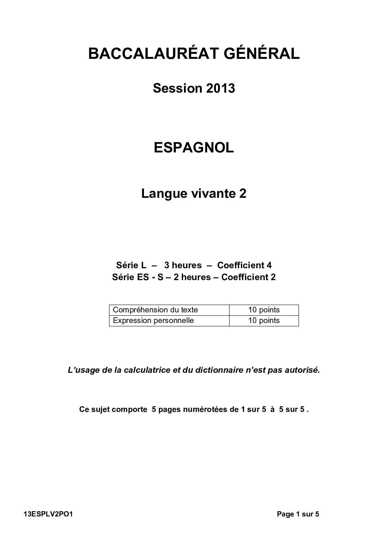 Bac S-ES-L Espagnol LV2 Polynésie 2013 - Sujet