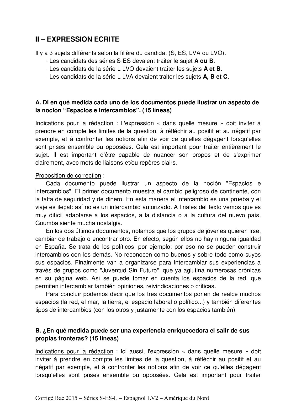 Bac S-ES-L Espagnol LV2 Amérique du Nord 2015 - Corrigé