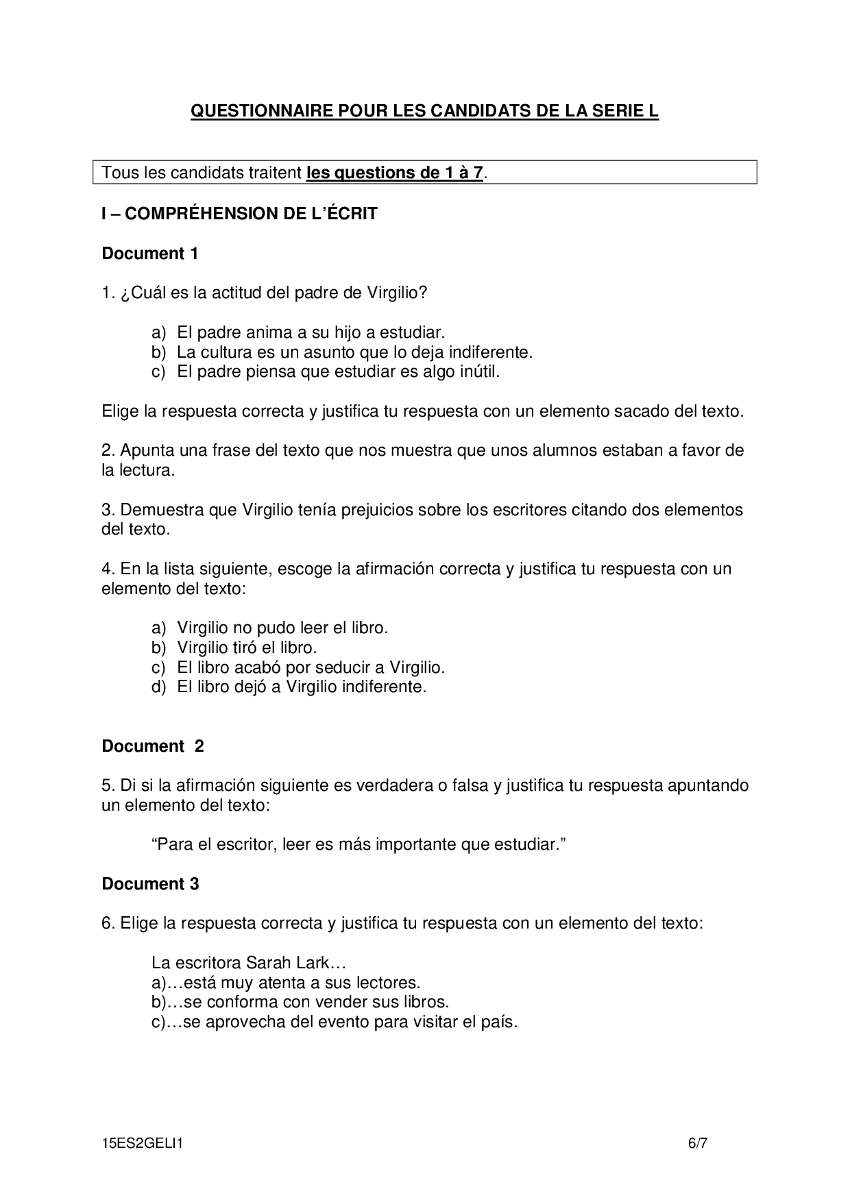 Bac S-ES-L Espagnol LV2 Liban 2015 - Sujet