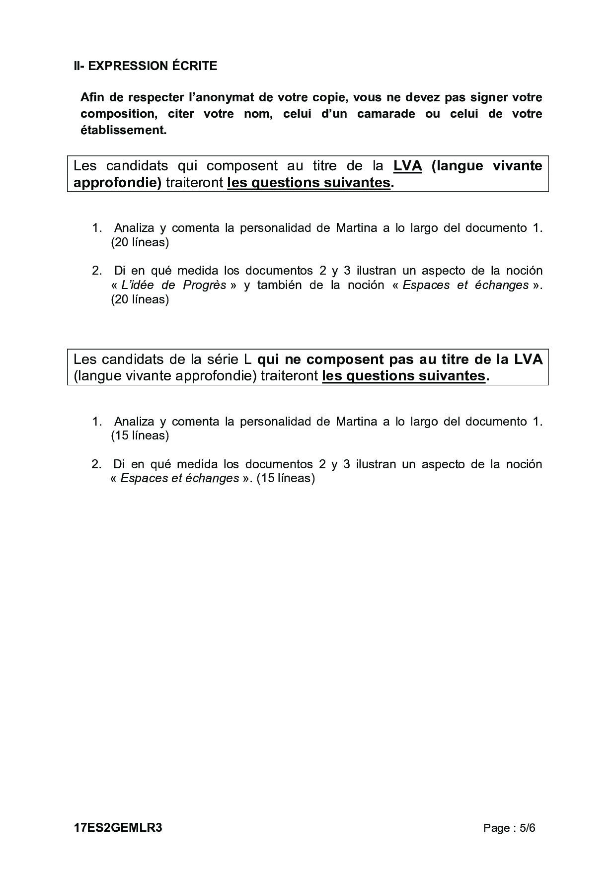 Bac S-ES-L Espagnol LV2 Métropole 2017 (Session de remplacement) - Sujet