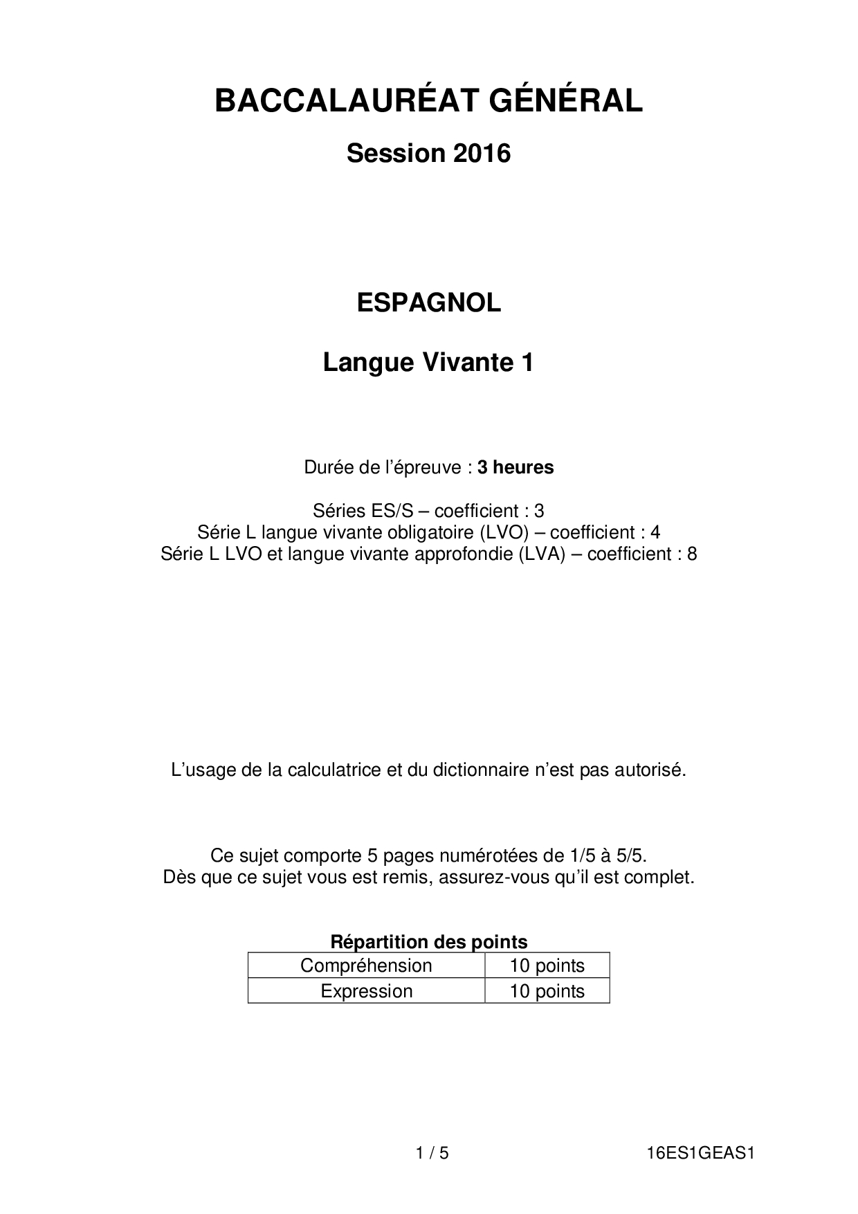 Bac S-ES-L Espagnol LV1 Amérique du Sud 2016 - Sujet