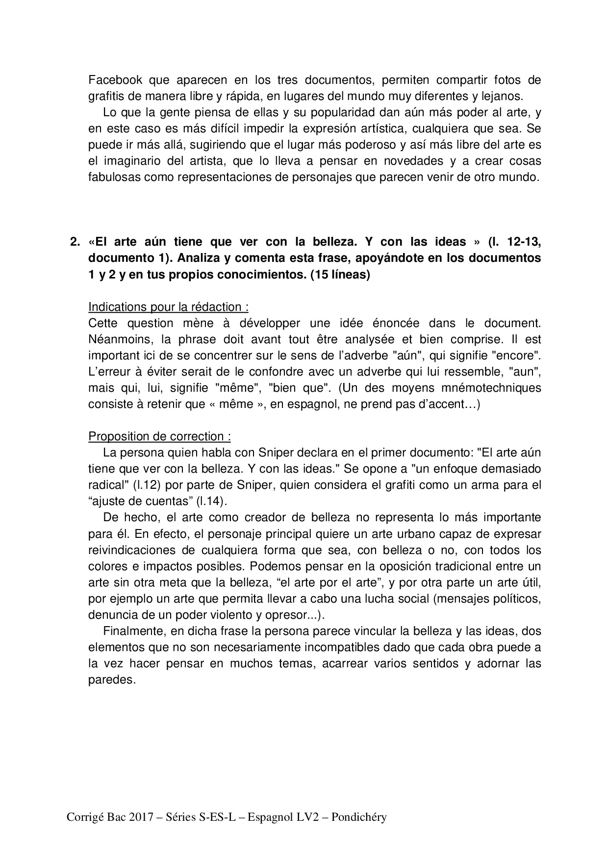 Bac S-ES-L Espagnol LV2 Pondichéry 2017 - Corrigé