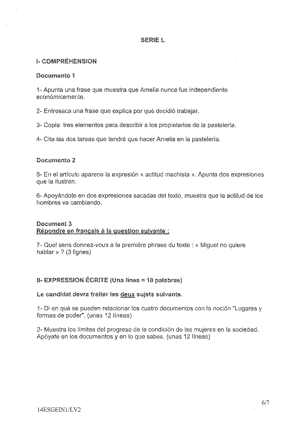 Bac S-ES-L Espagnol LV2 Pondichéry 2014 - Sujet