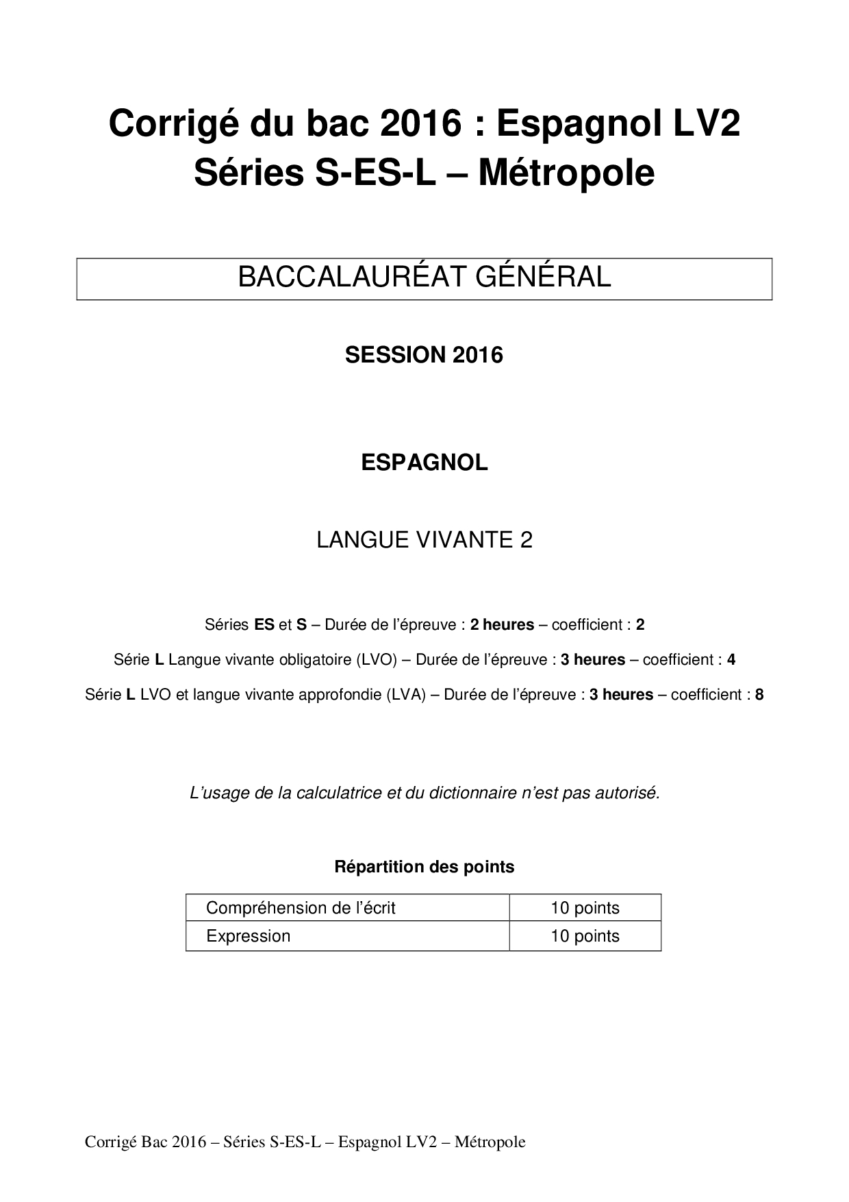 Bac S-ES-L Espagnol LV2 Métropole 2016 - Corrigé