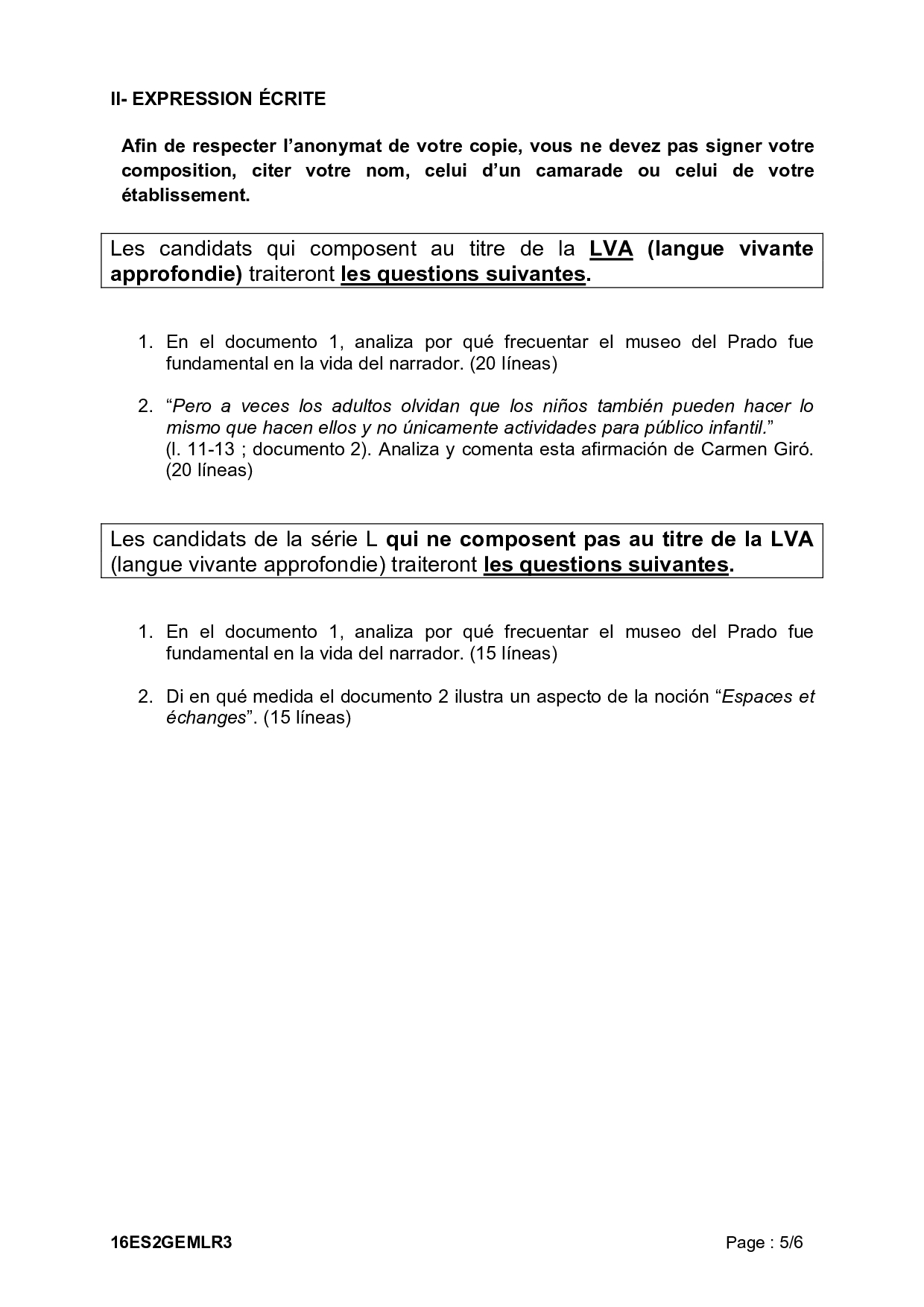Bac S-ES-L Espagnol LV2 Métropole 2016 (Session de remplacement) - Sujet