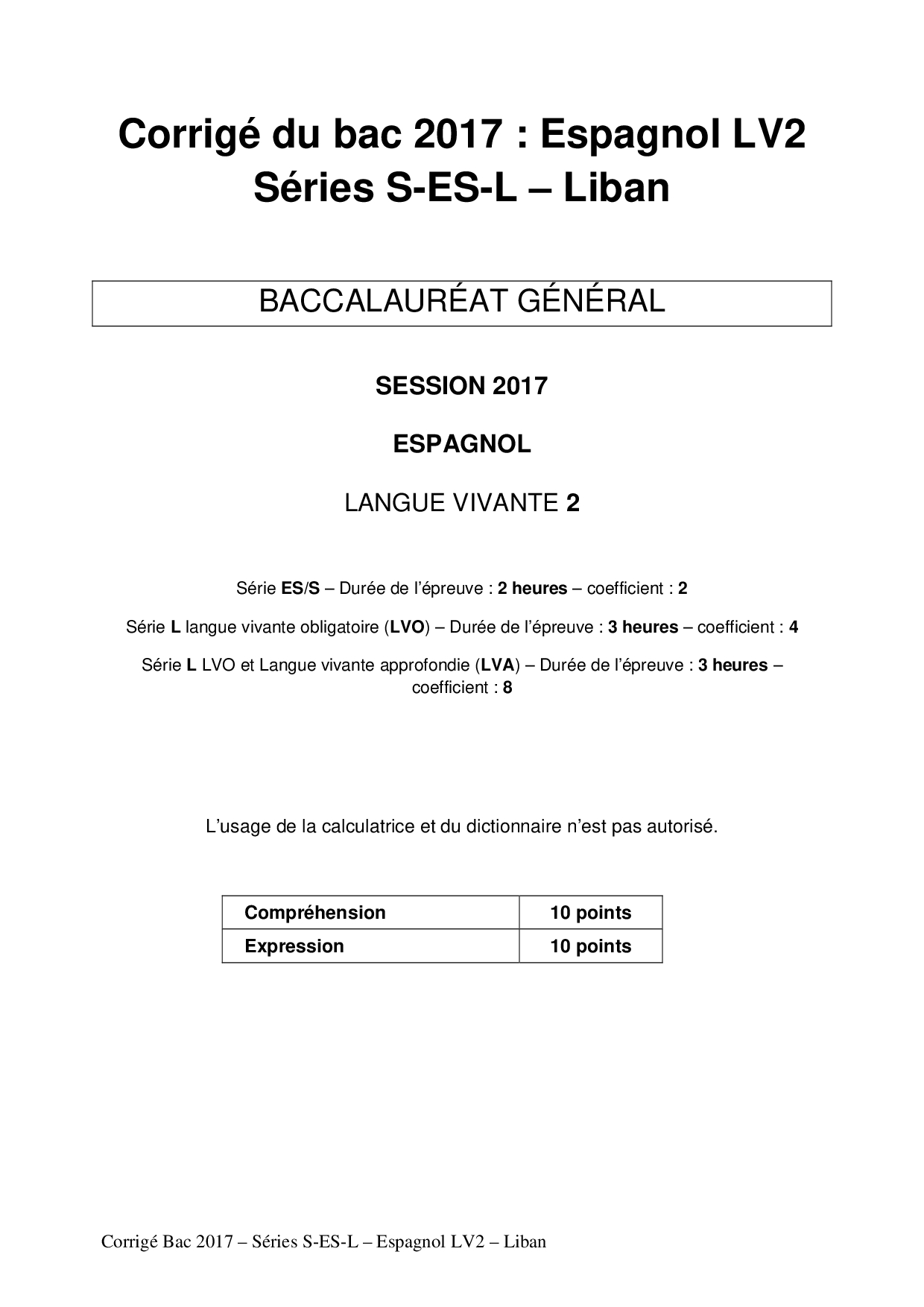 Bac S-ES-L Espagnol LV2 Liban 2017 - Corrigé