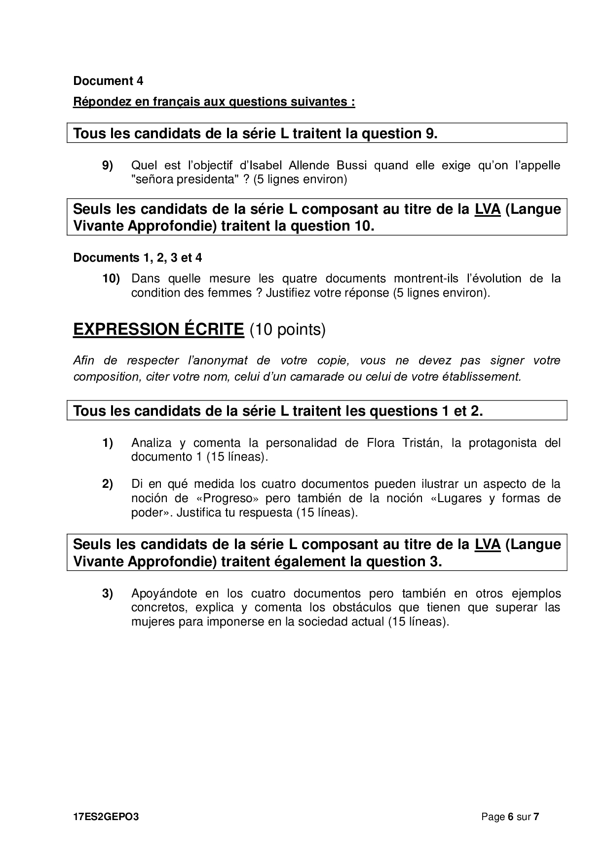 Bac S-ES-L Espagnol LV2 Polynésie 2017 (Session de remplacement) - Sujet