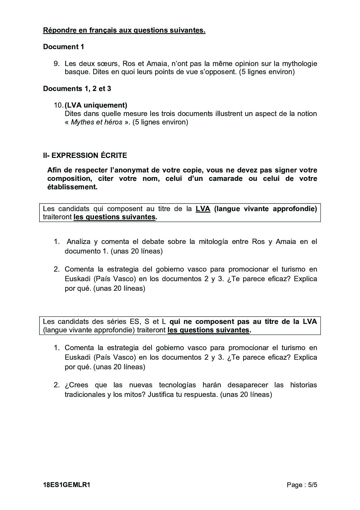 Bac S-ES-L Espagnol LV1 Métropole 2018 - Sujet