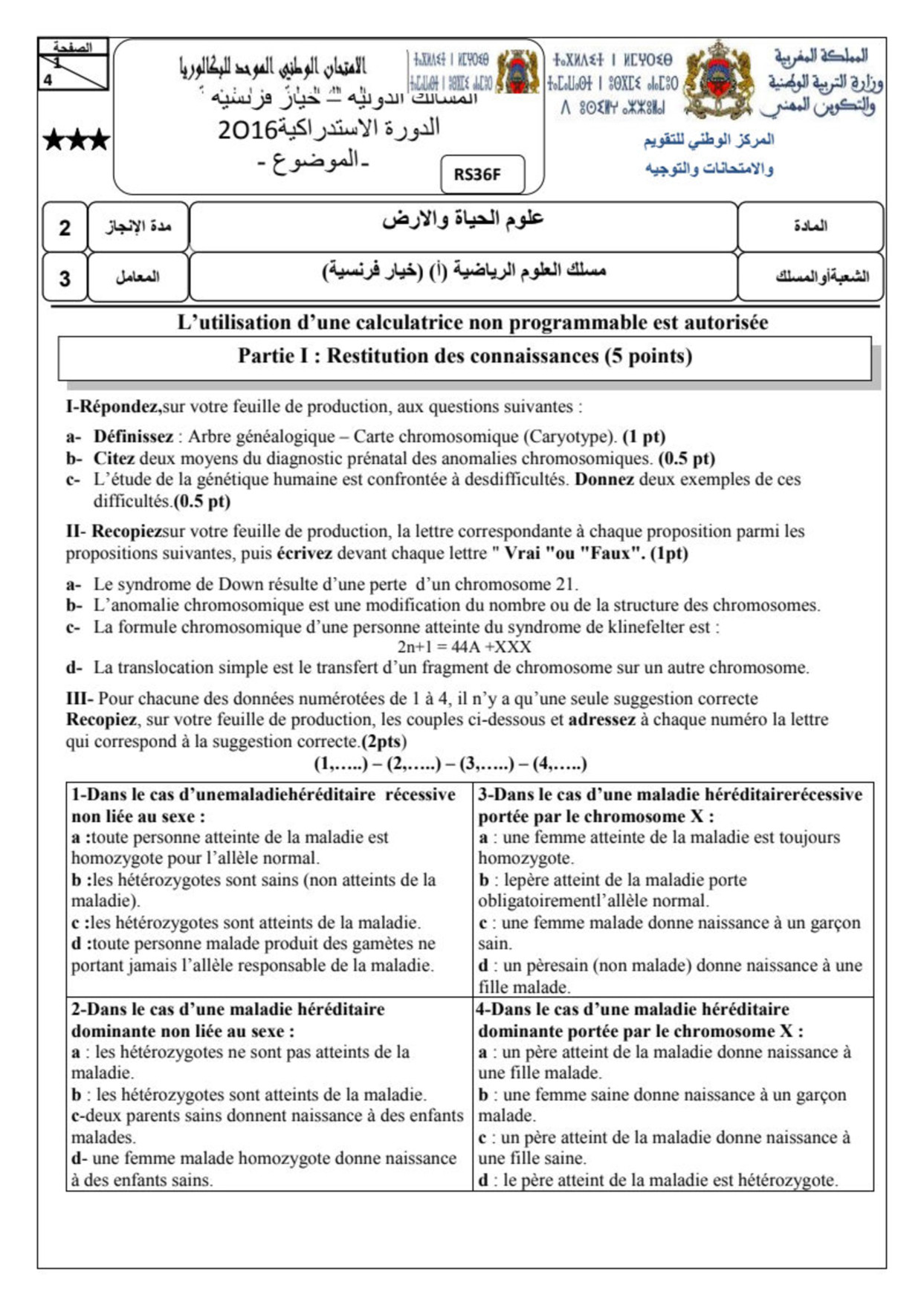 Examen National SVT Sciences Maths A 2016 Rattrapage - Sujet