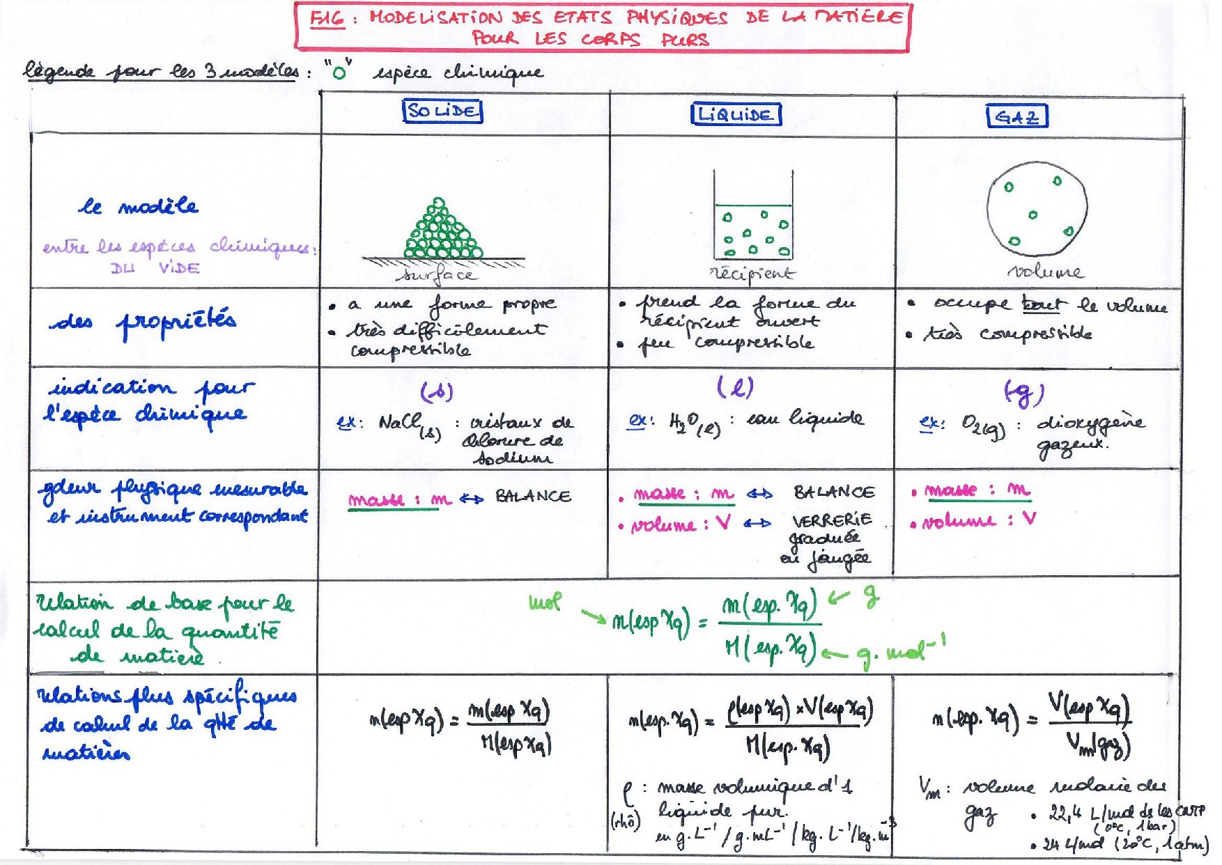 Modélisation des états physiques de la matière pour les corps purs - Fiche résumé