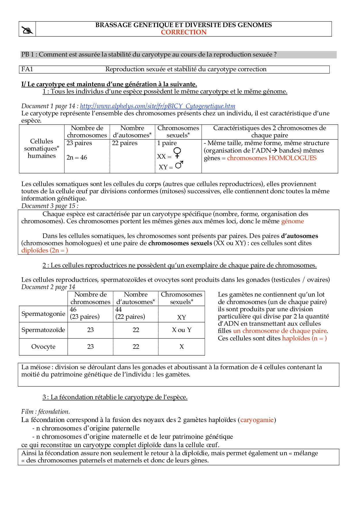 Correction Fiche d'Activités - Reproduction sexuée et stabilité du caryotype