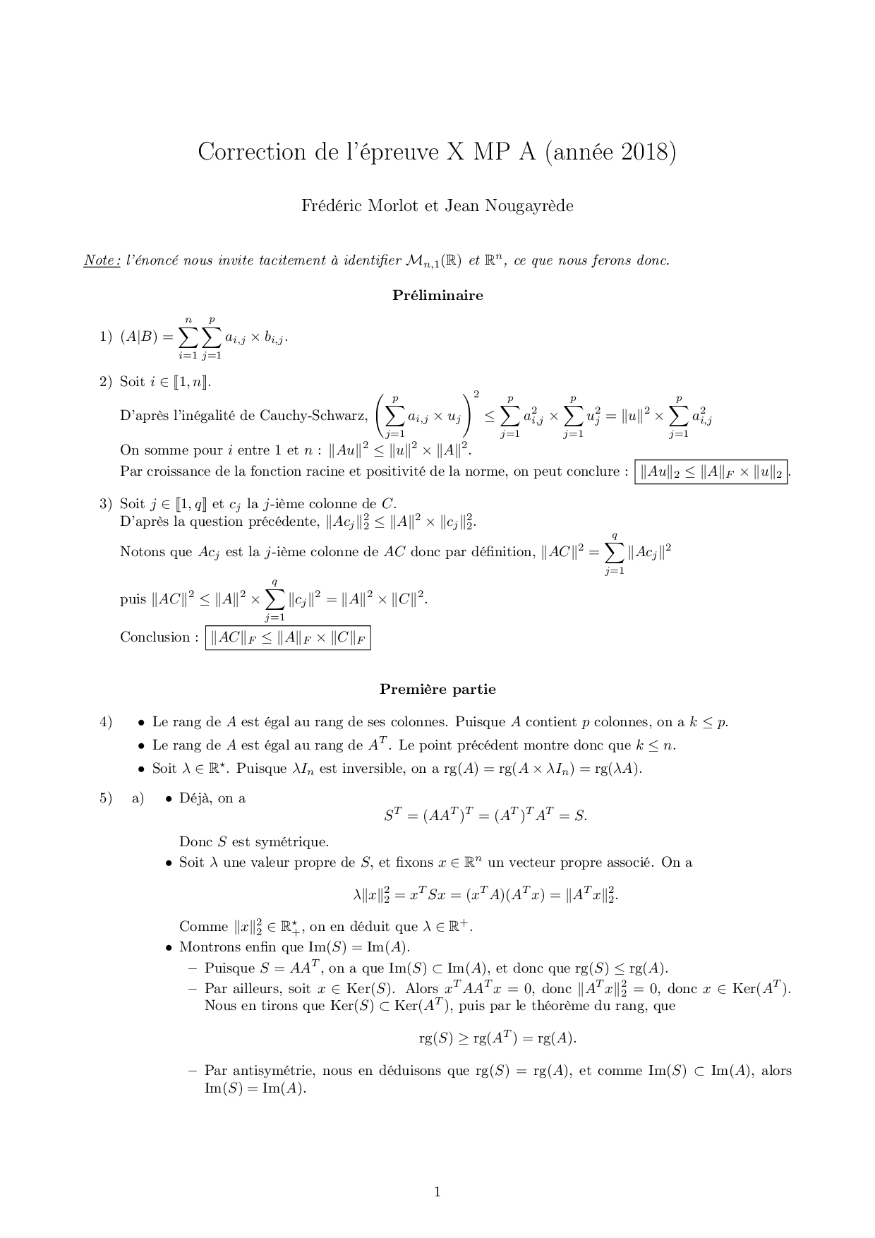 X-ENS MP 2018 Maths A - Corrigé