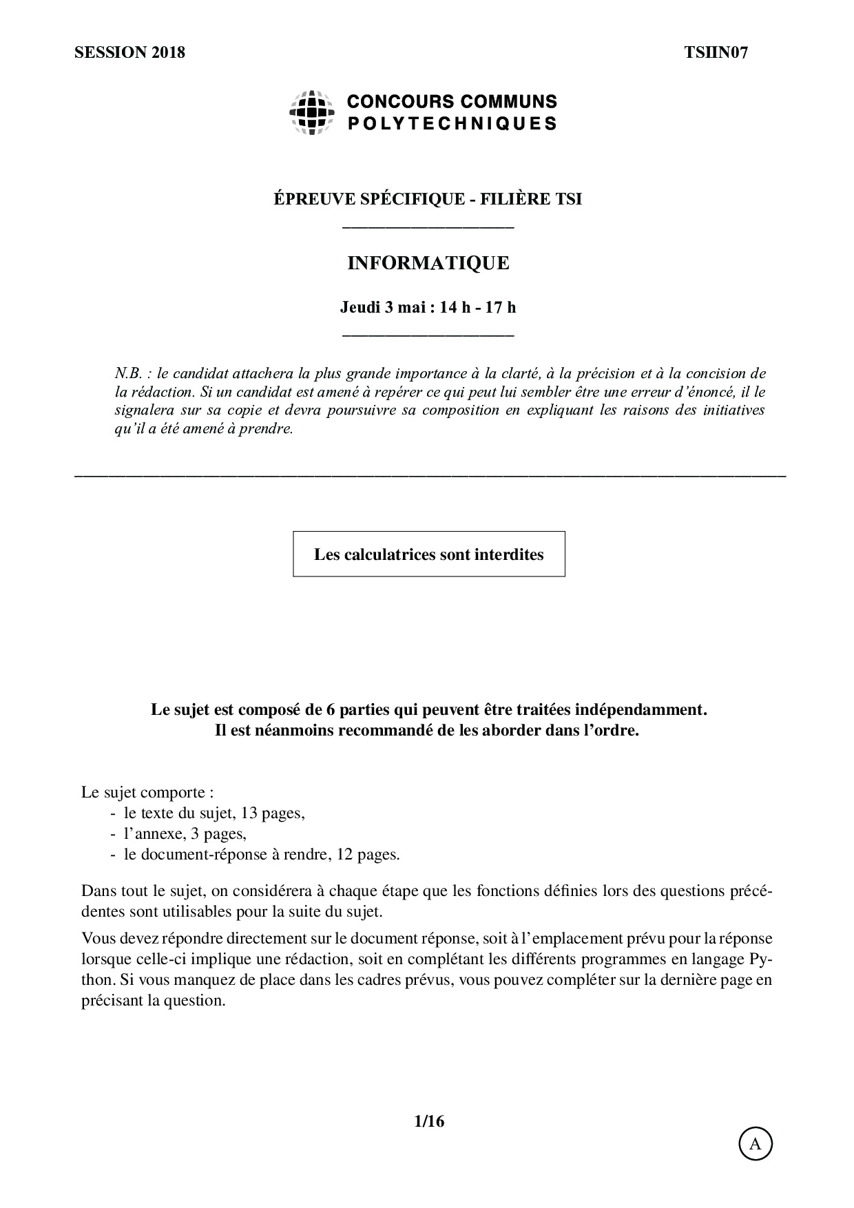CCP TSI 2018 Informatique - Sujet