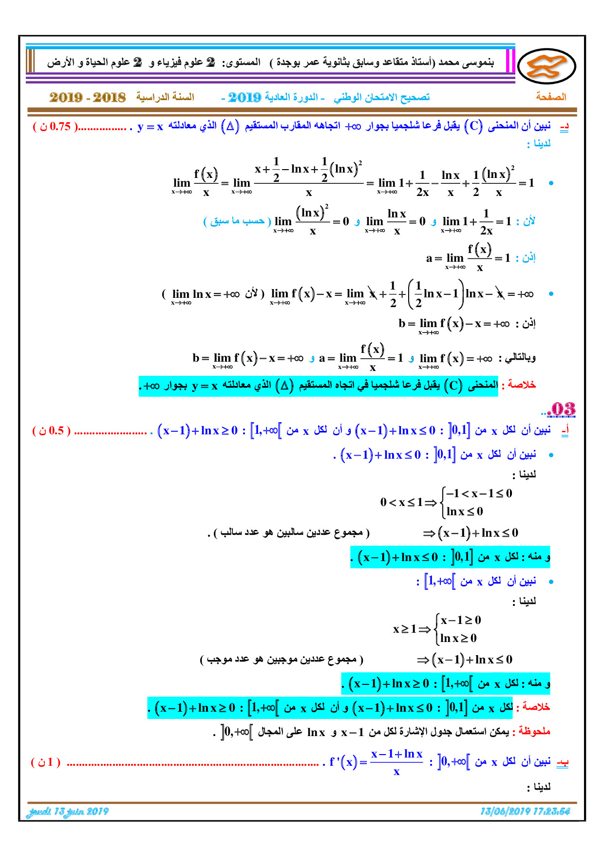 الرياضيات للشعب العلمية والتكنولوجية 2019 الدورة العادية - التصحيح