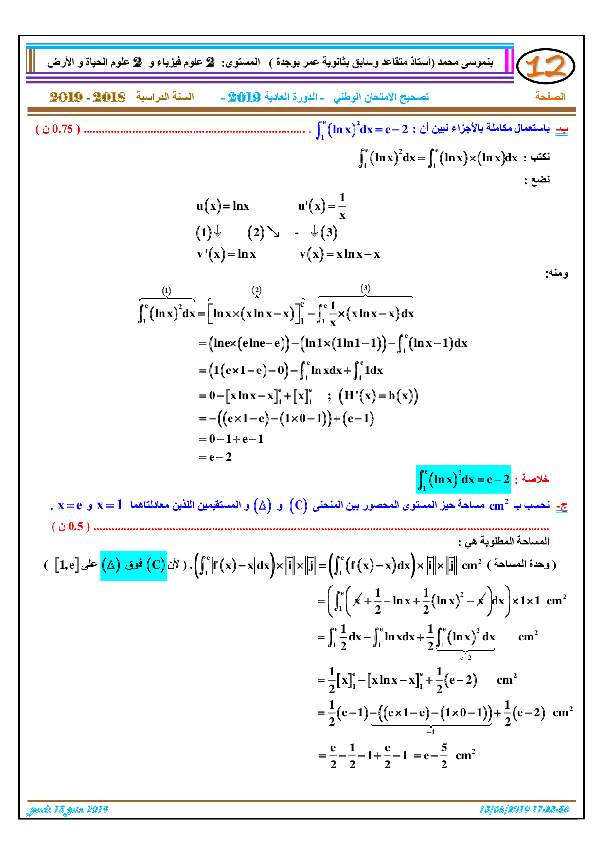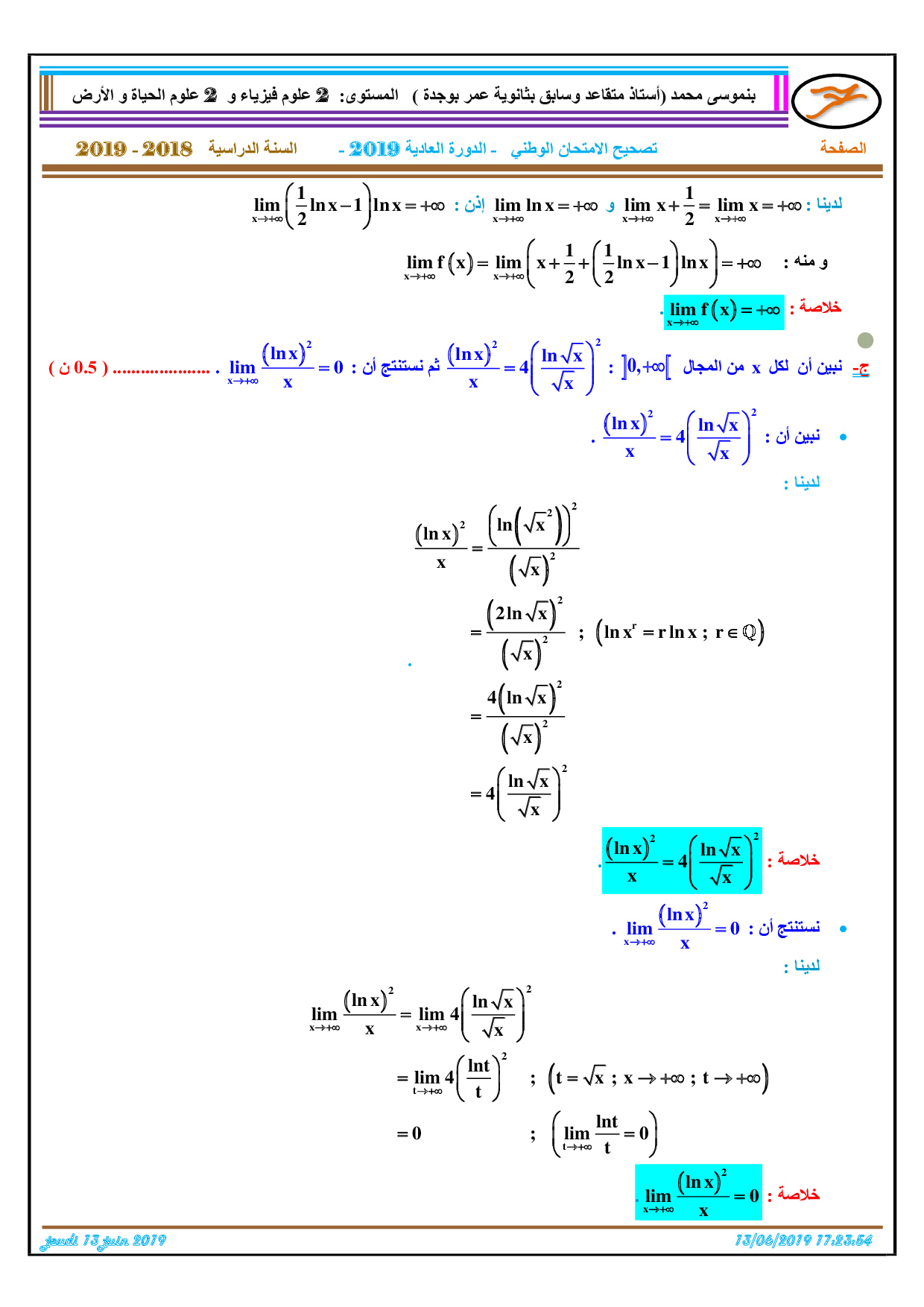 الرياضيات للشعب العلمية والتكنولوجية 2019 الدورة العادية - التصحيح