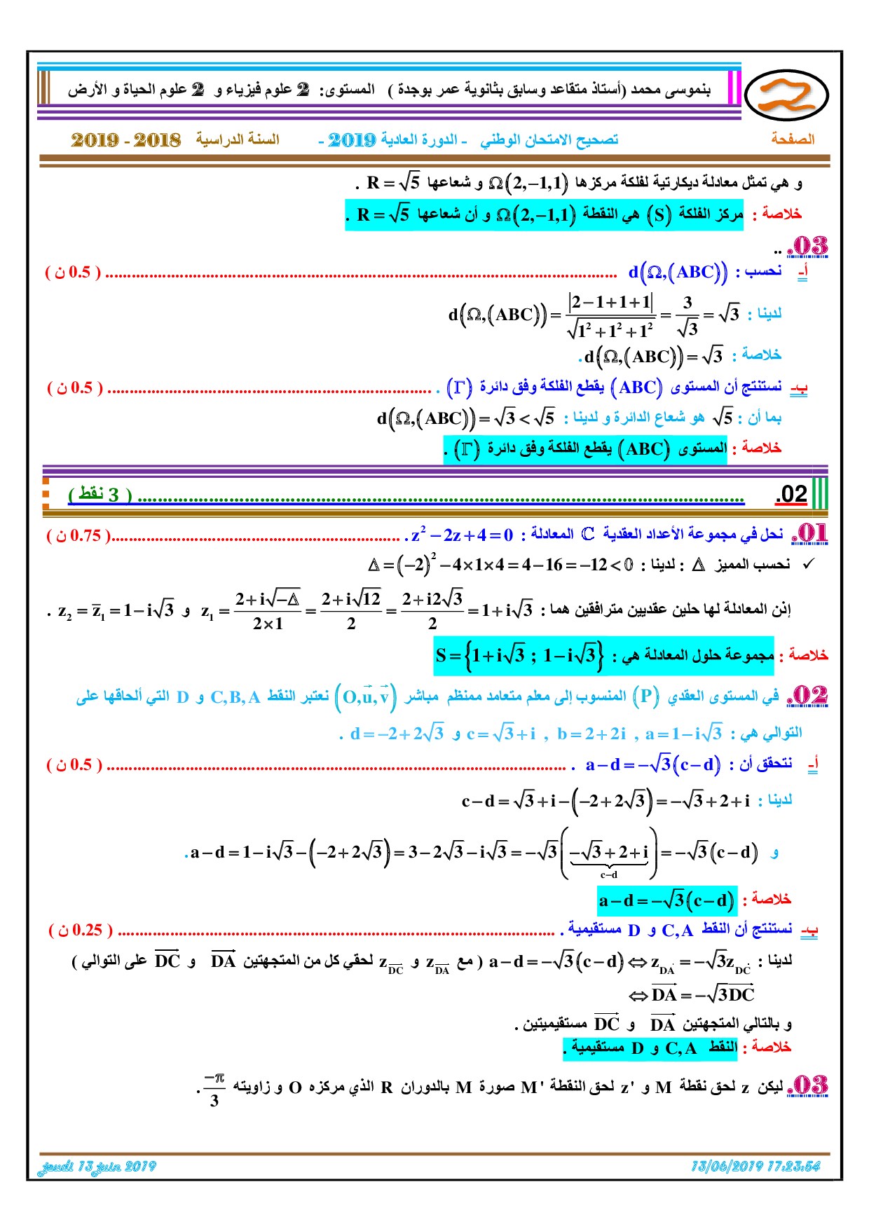 الرياضيات للشعب العلمية والتكنولوجية 2019 الدورة العادية - التصحيح