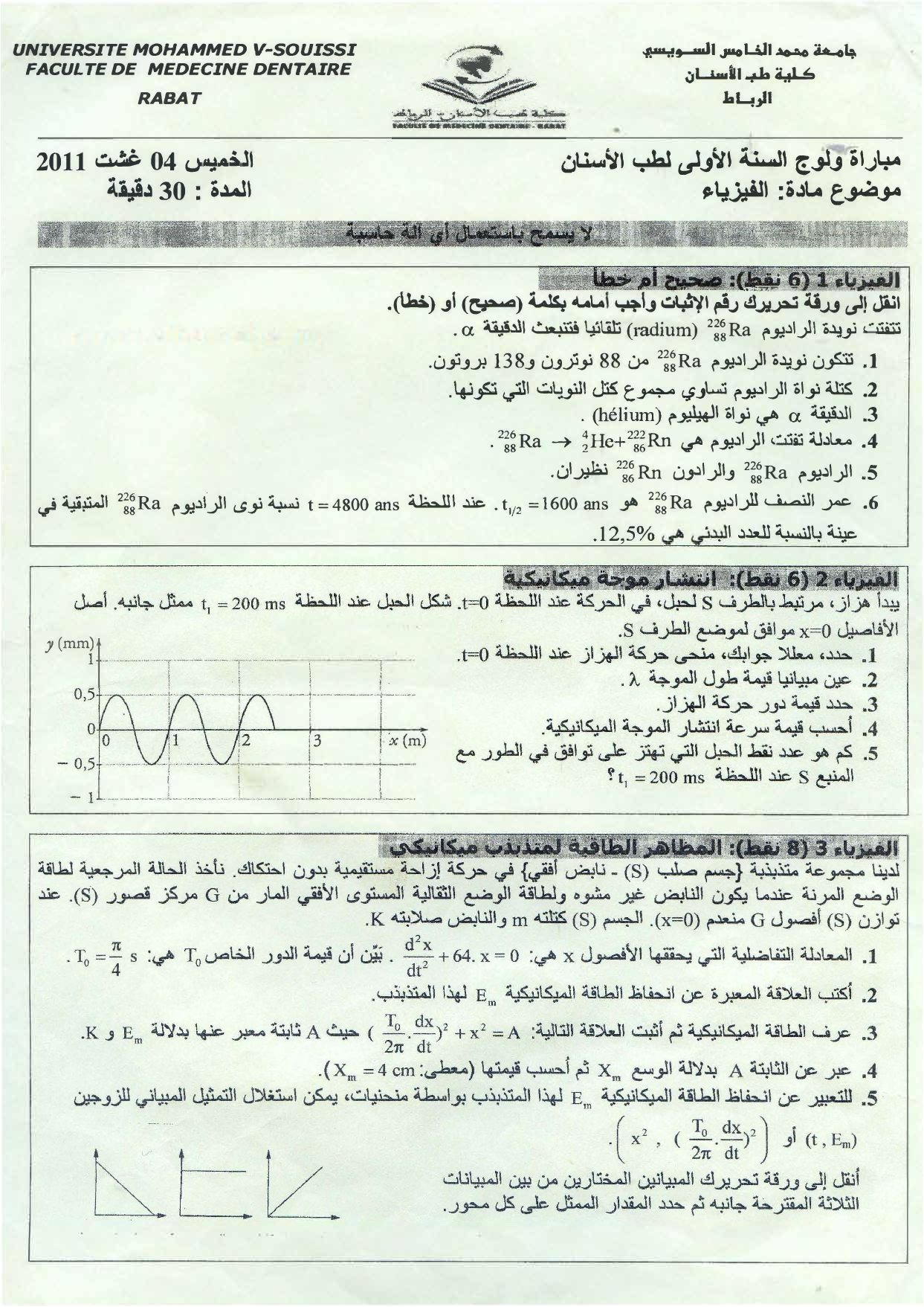 مباراة ولوج كلية طب الأسنان 2011 (الرباط) - الموضوع