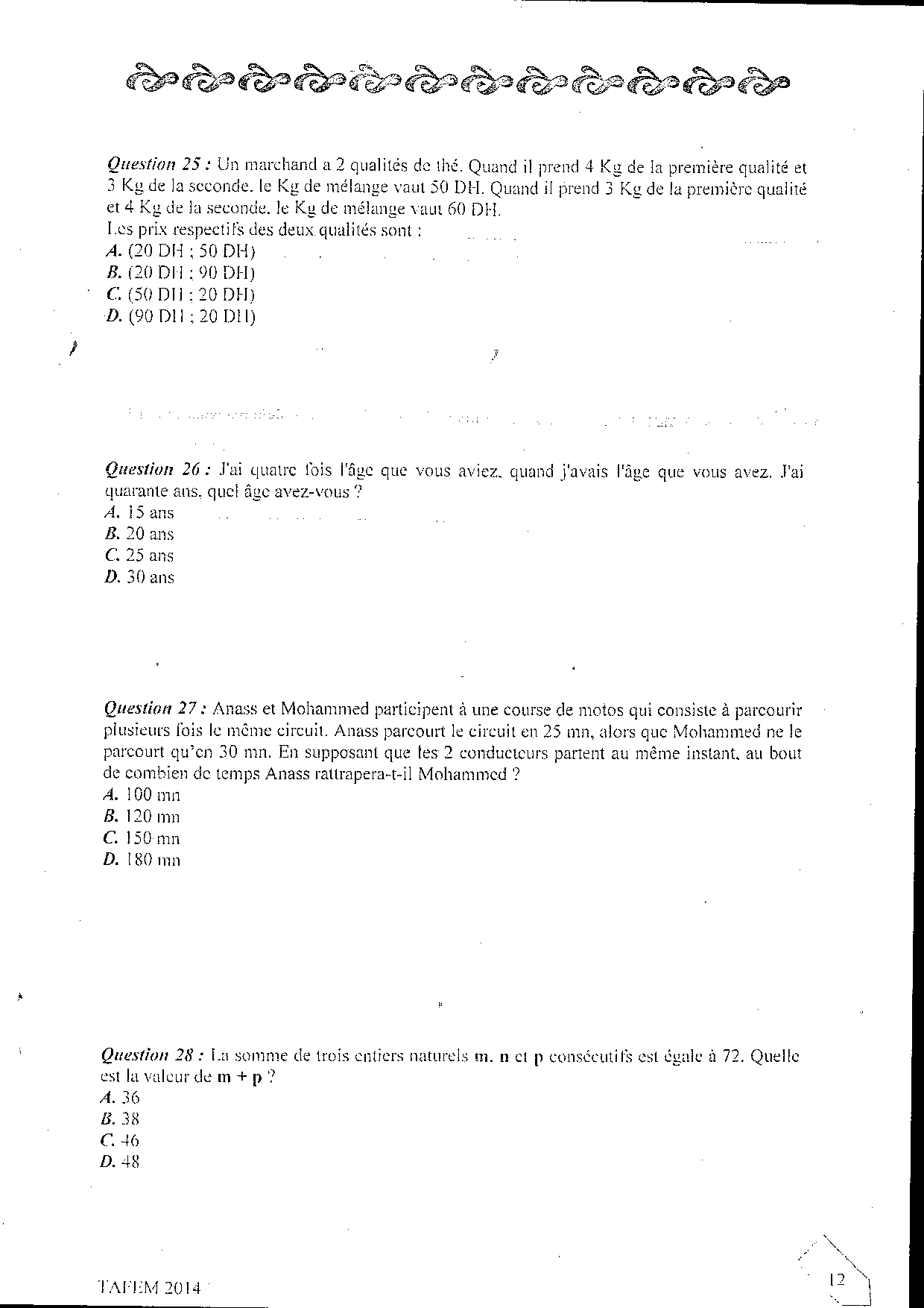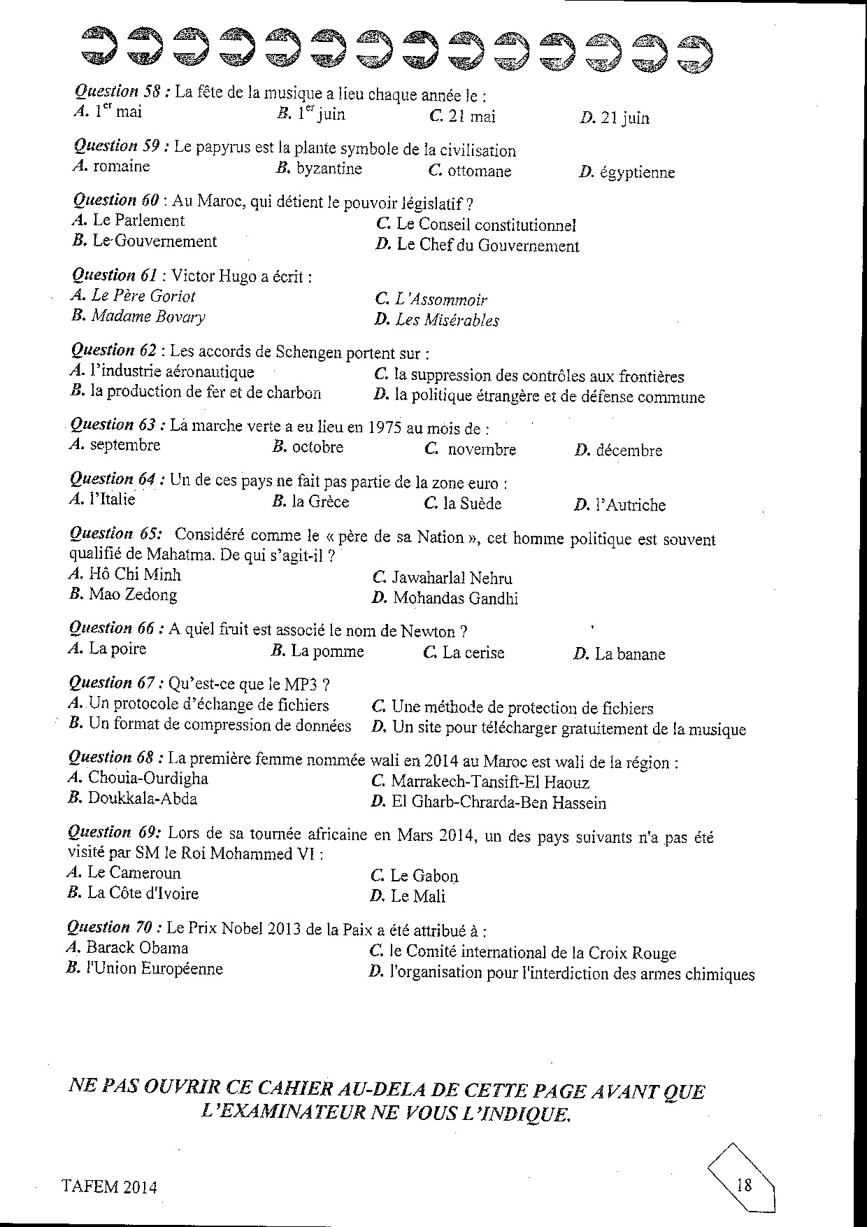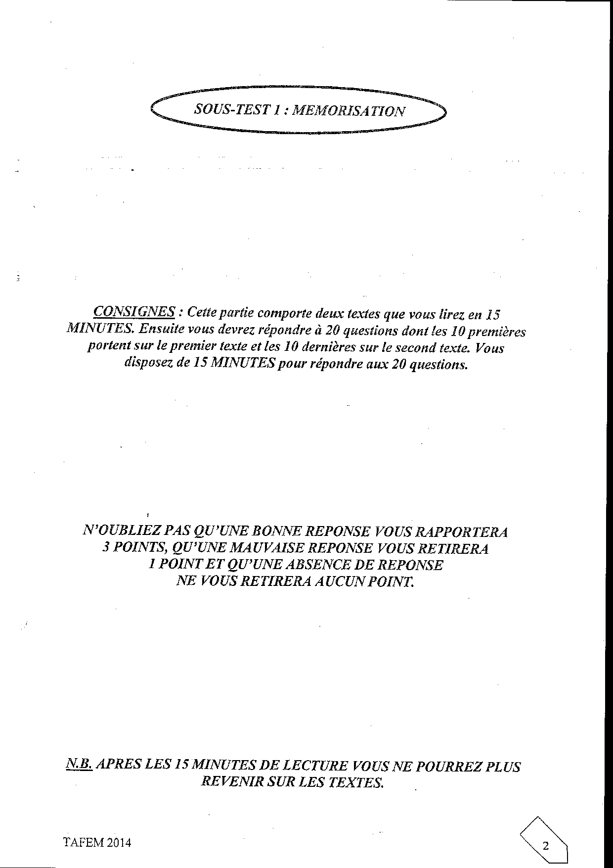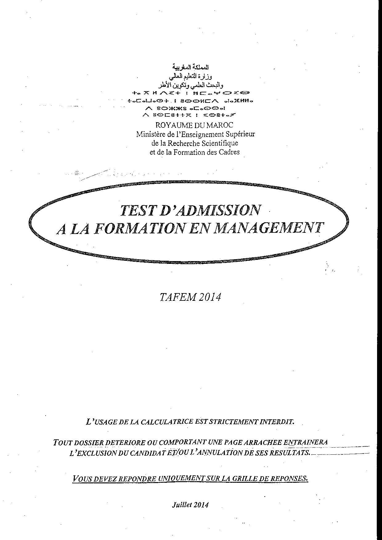 Test d'Admission à la Formation En Management (TAFEM) 2014 - Epreuve