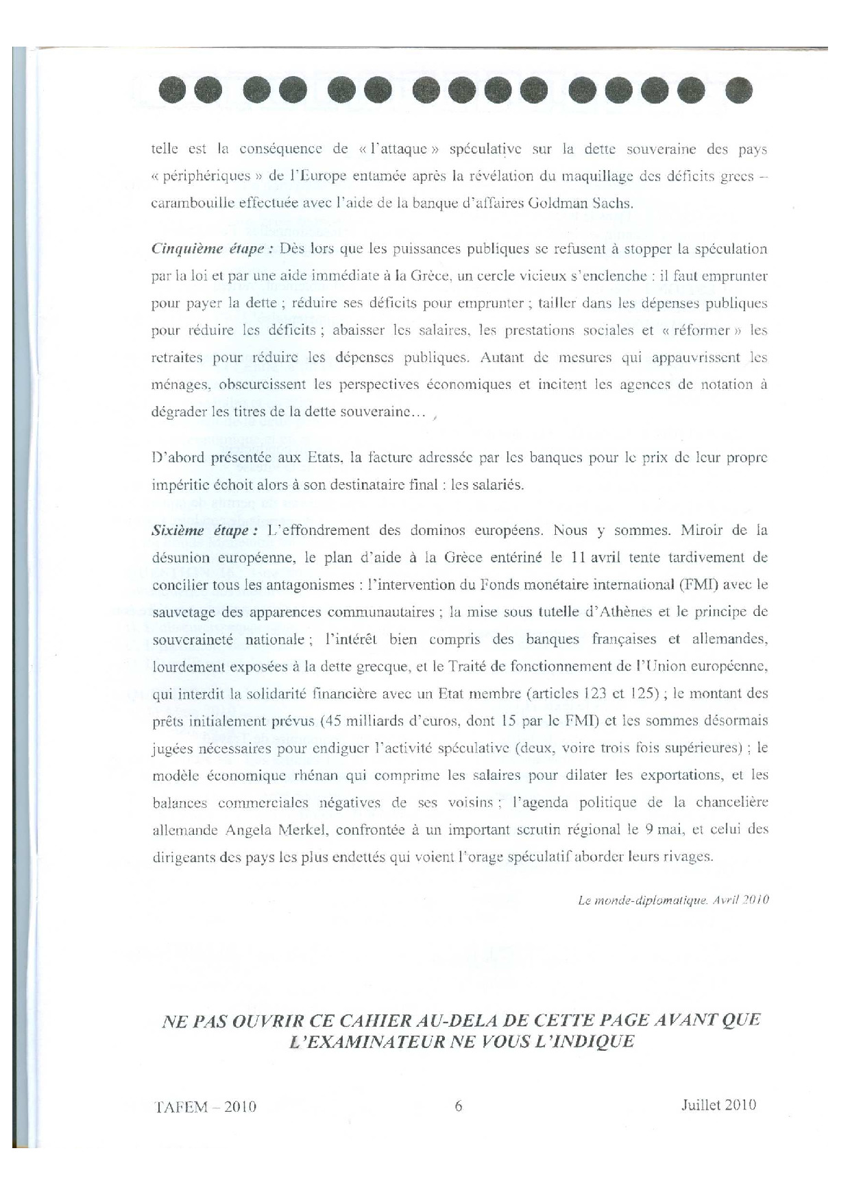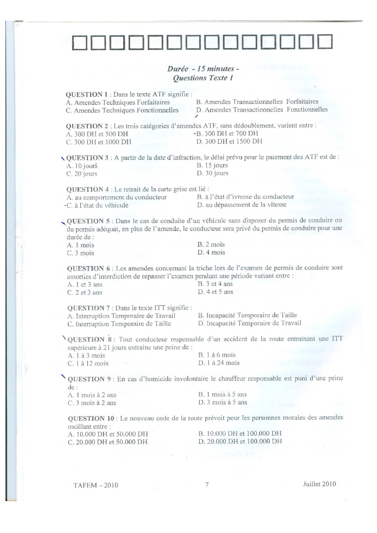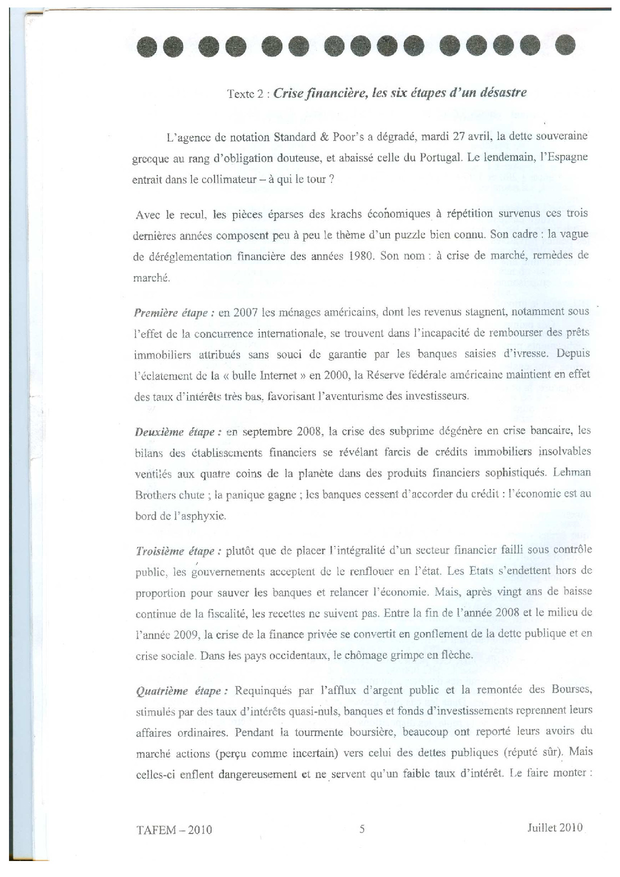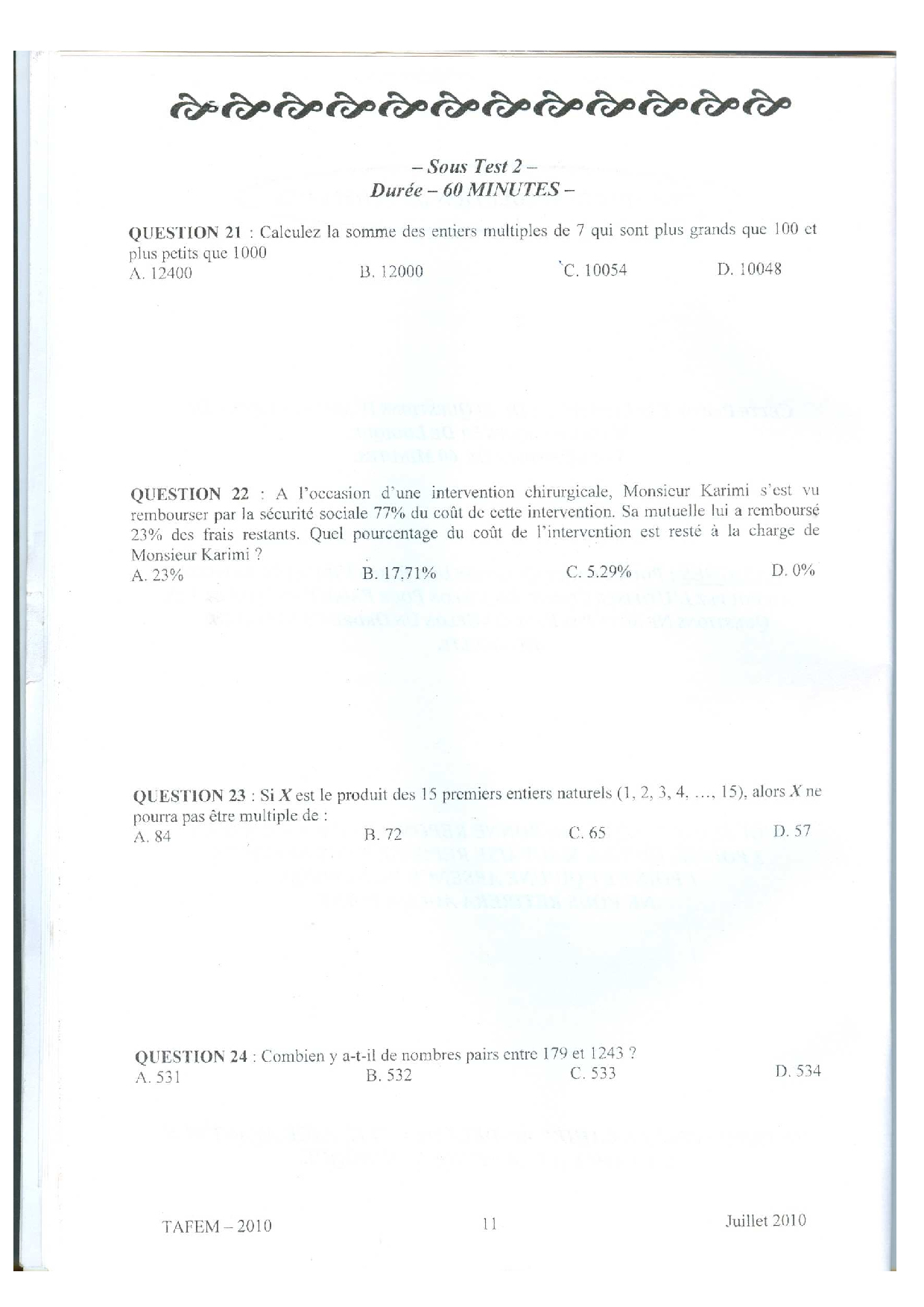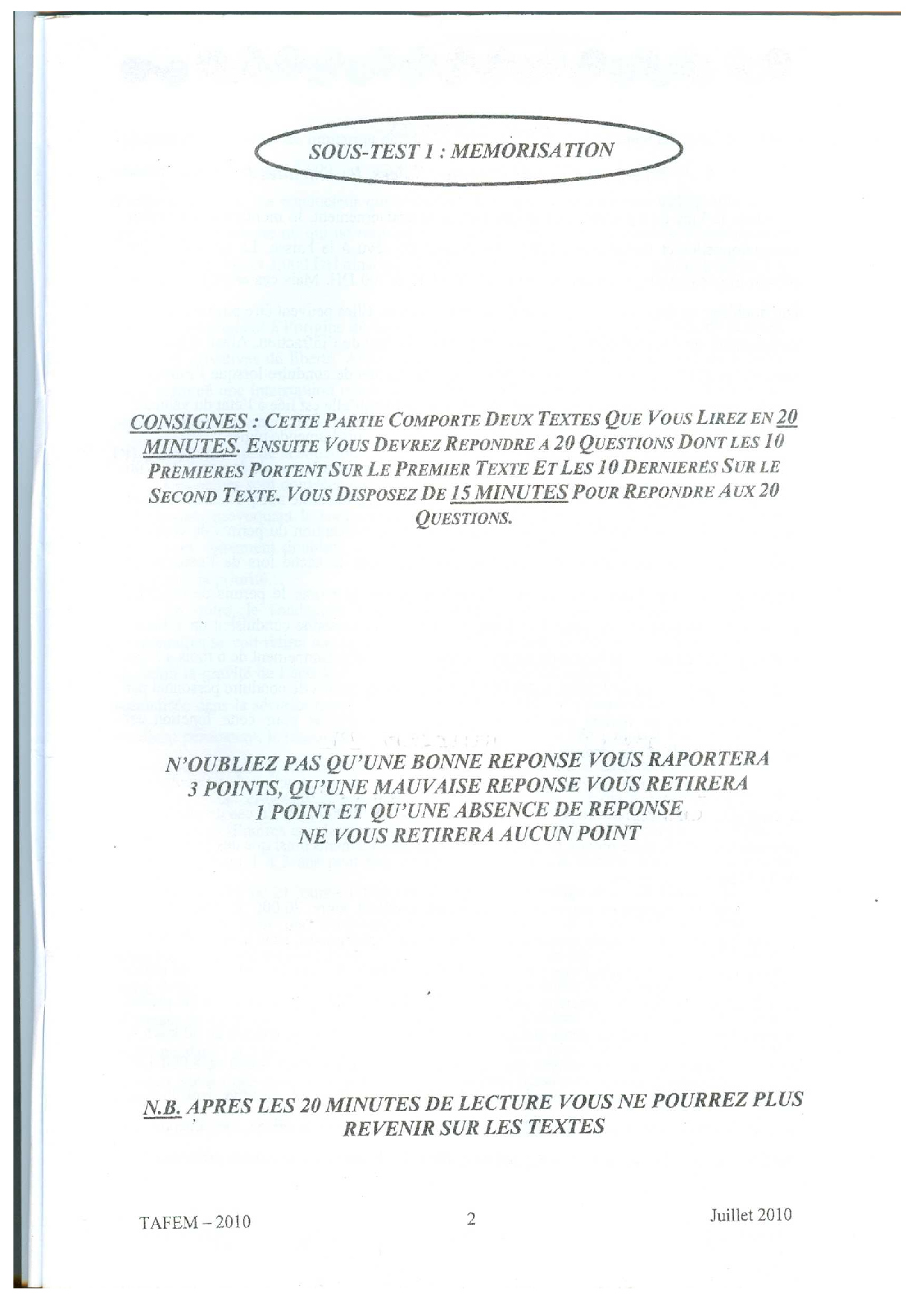 Test d'Admission à la Formation En Management (TAFEM) 2010 - Epreuve