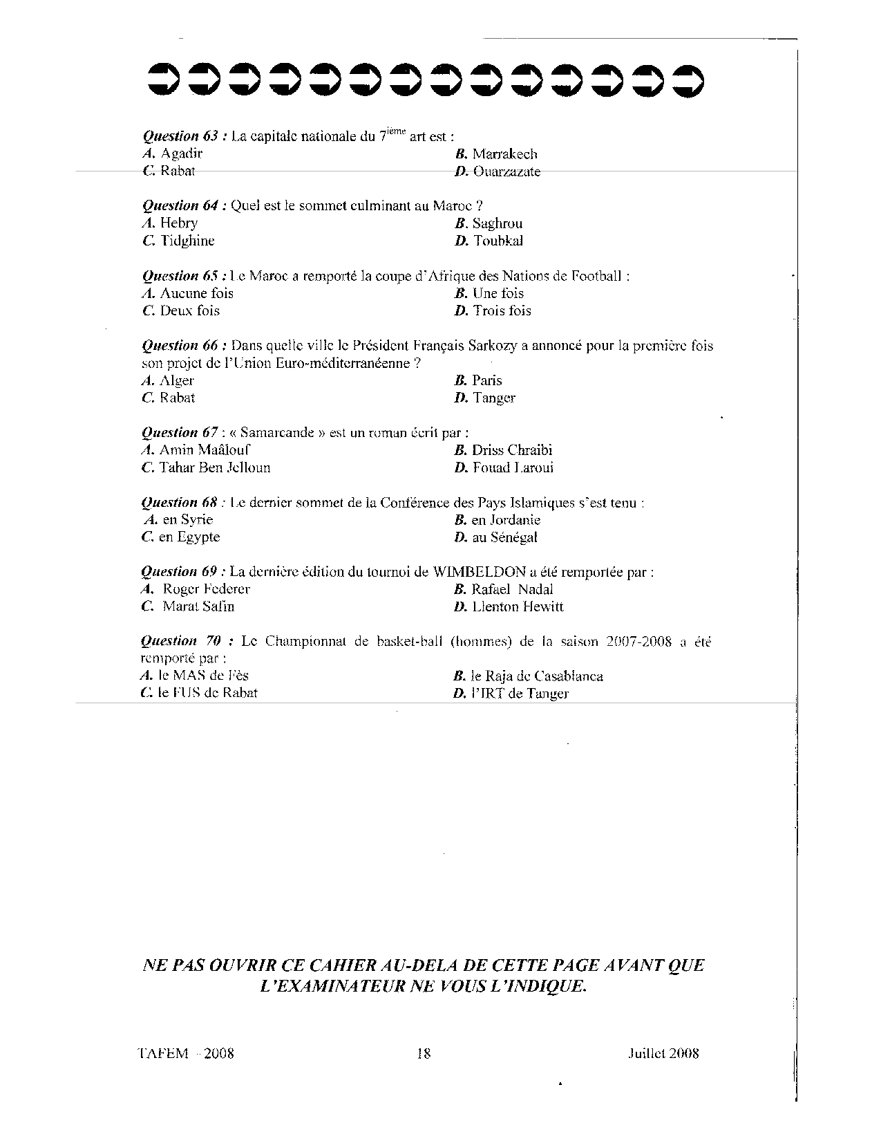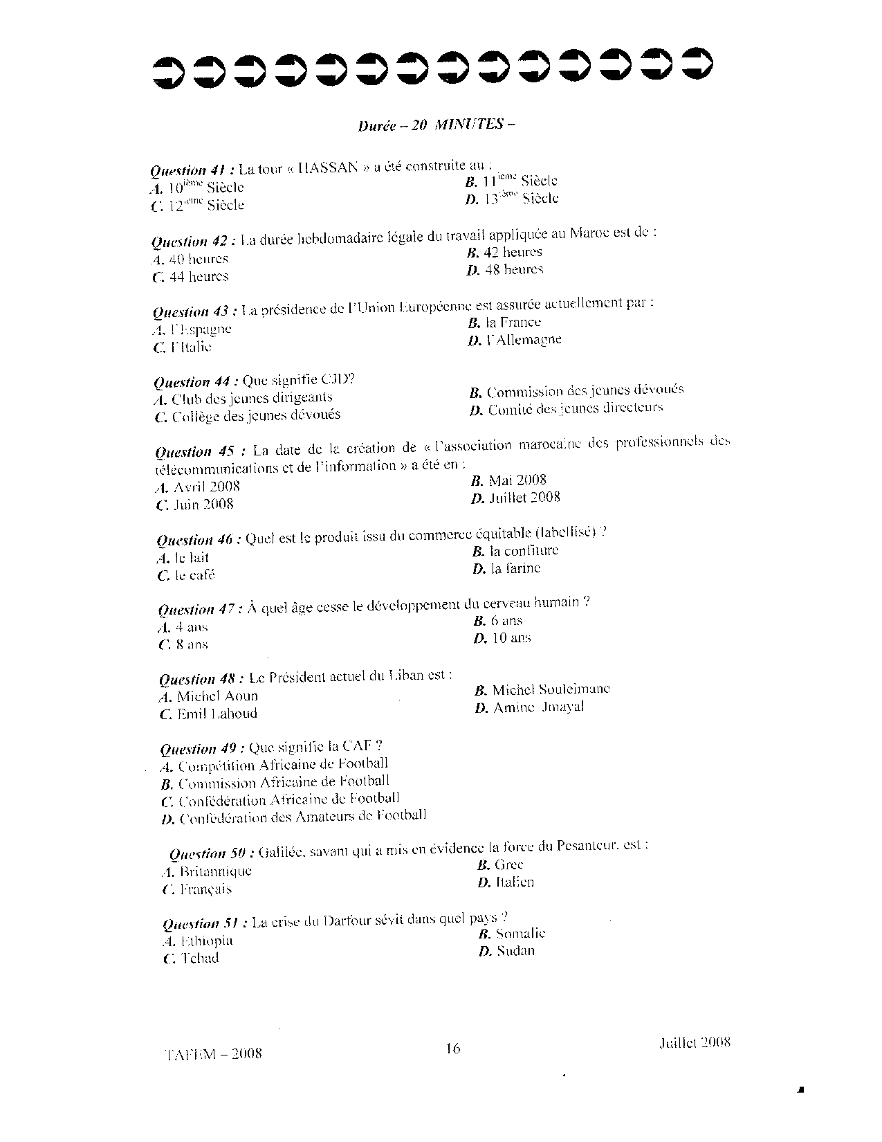 Test d'Admission à la Formation En Management (TAFEM) 2008 - Epreuve