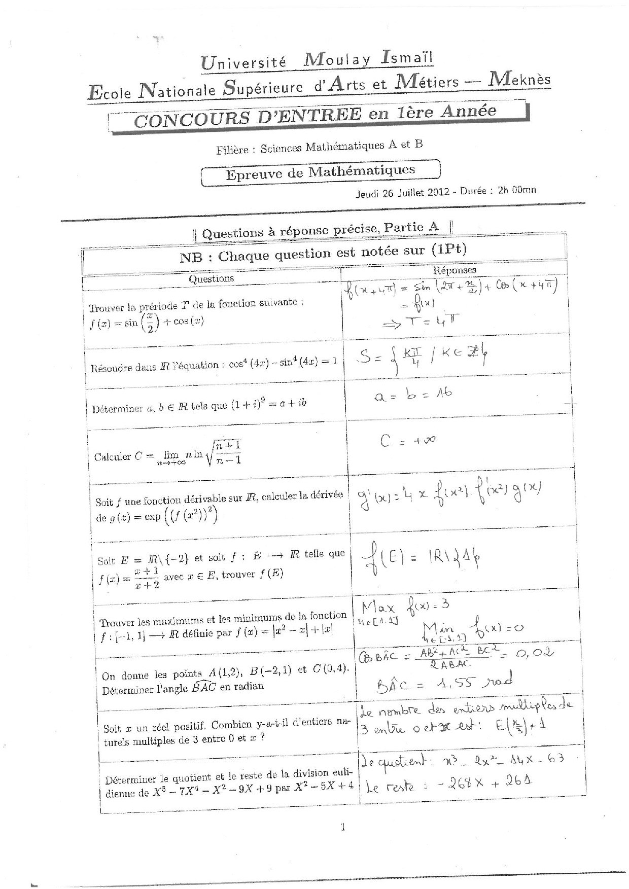 Concours d'entrée ENSAM 2012 Sciences Maths (Maths) - Corrigé