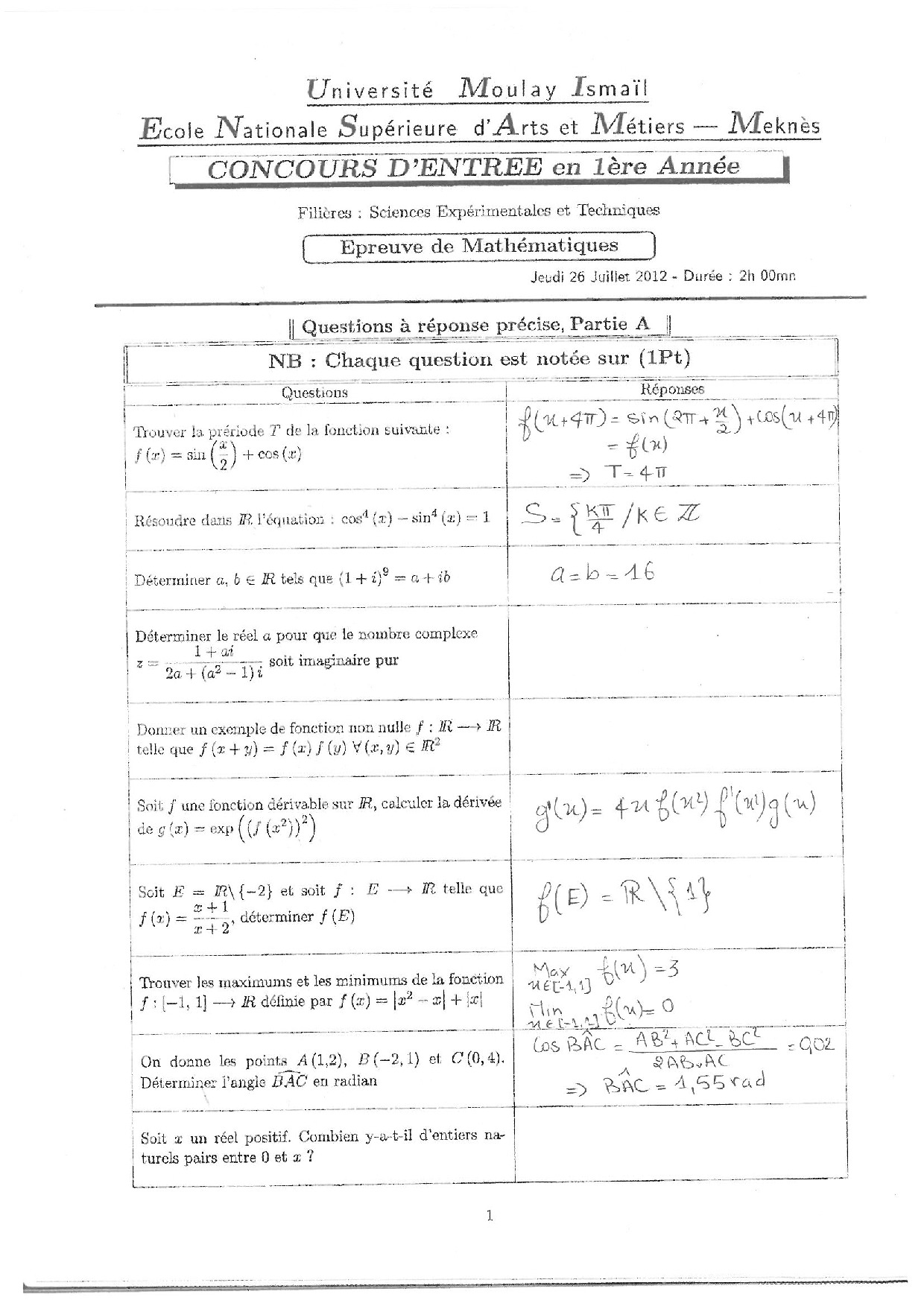 Concours d'entrée ENSAM 2012 SPC-SVT-STE-STM (Maths) - Corrigé