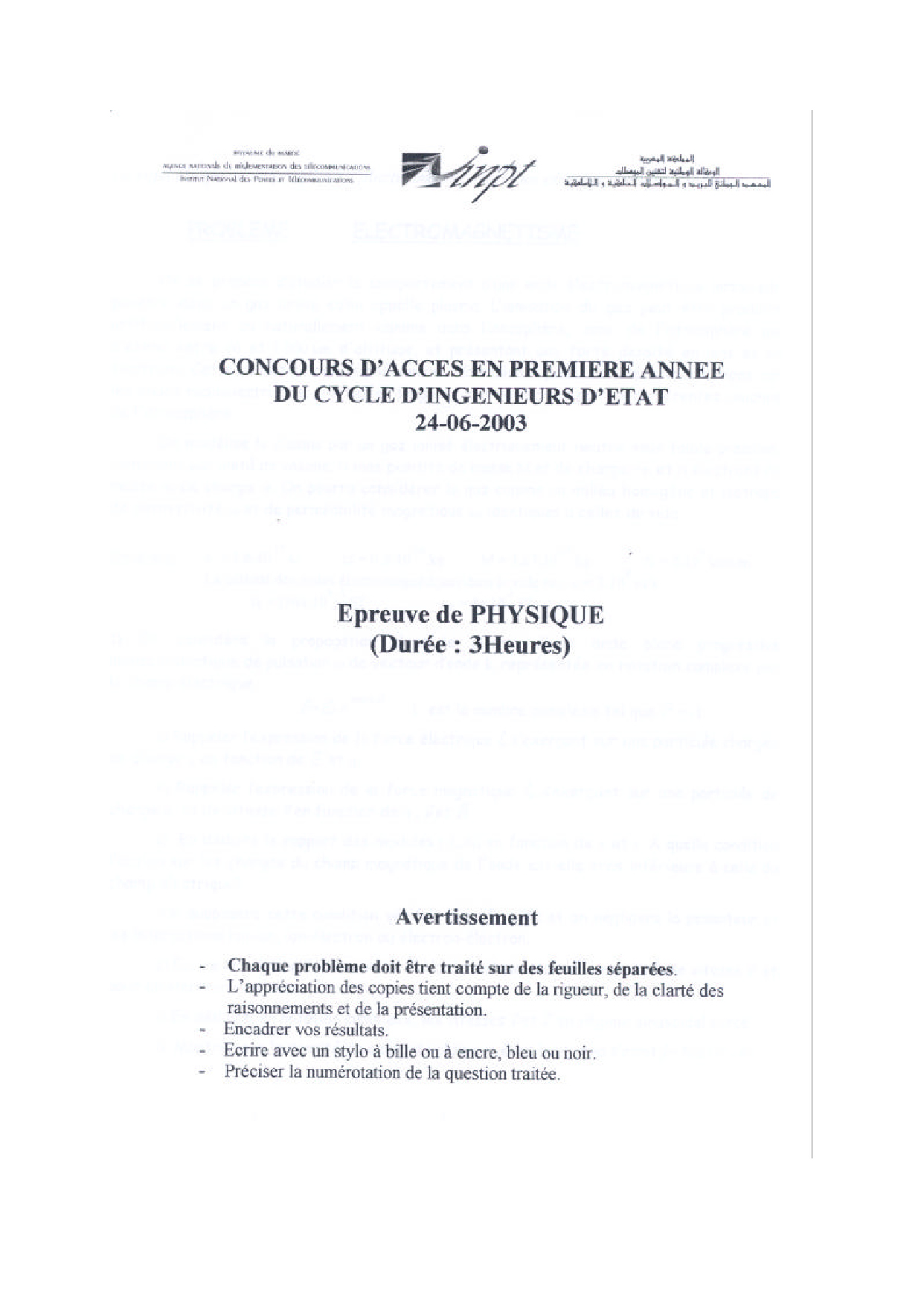 Concours d'entrée INPT 1ère année 2003 - Physique