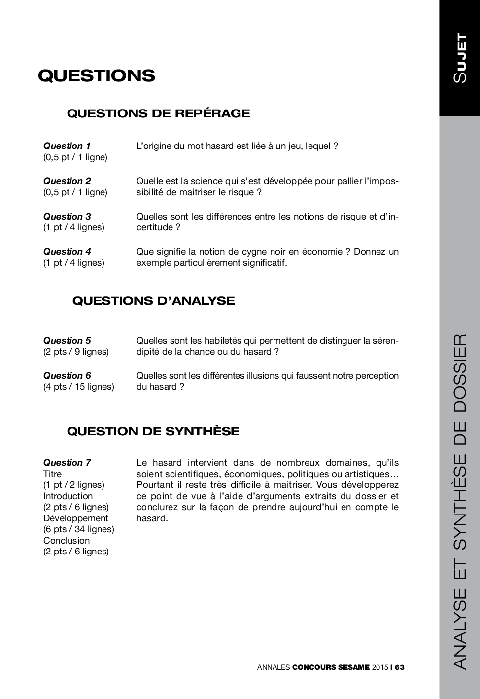 Concours SÉSAME 2015 - Analyse et synthèse de dossier (Questions)