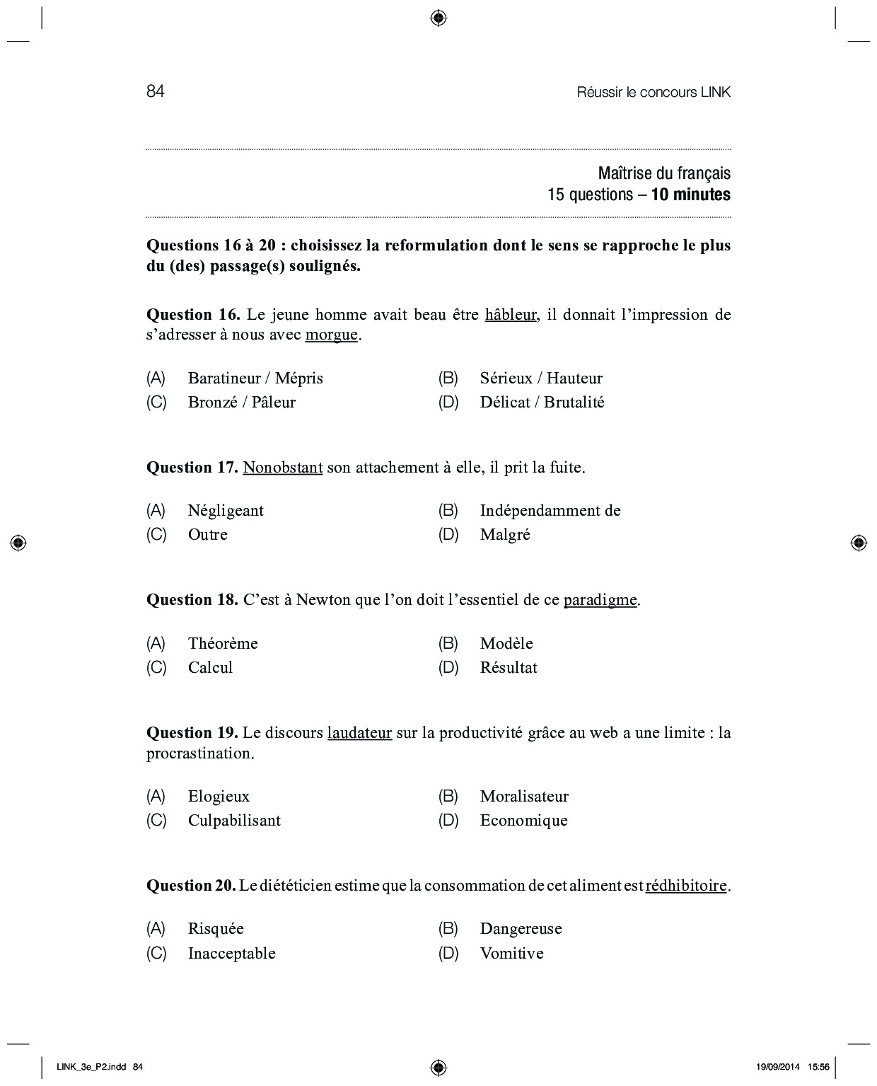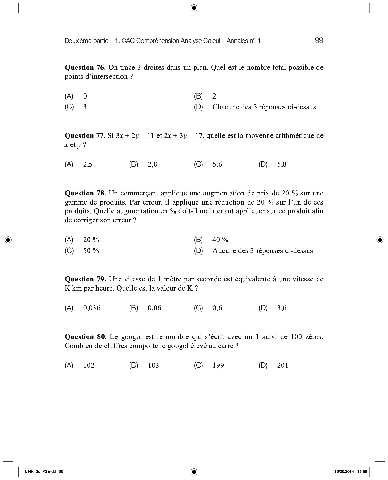 Concours LINK 2014 - CAC 1 (Compréhension, Analyse, Calcul - Sujet)