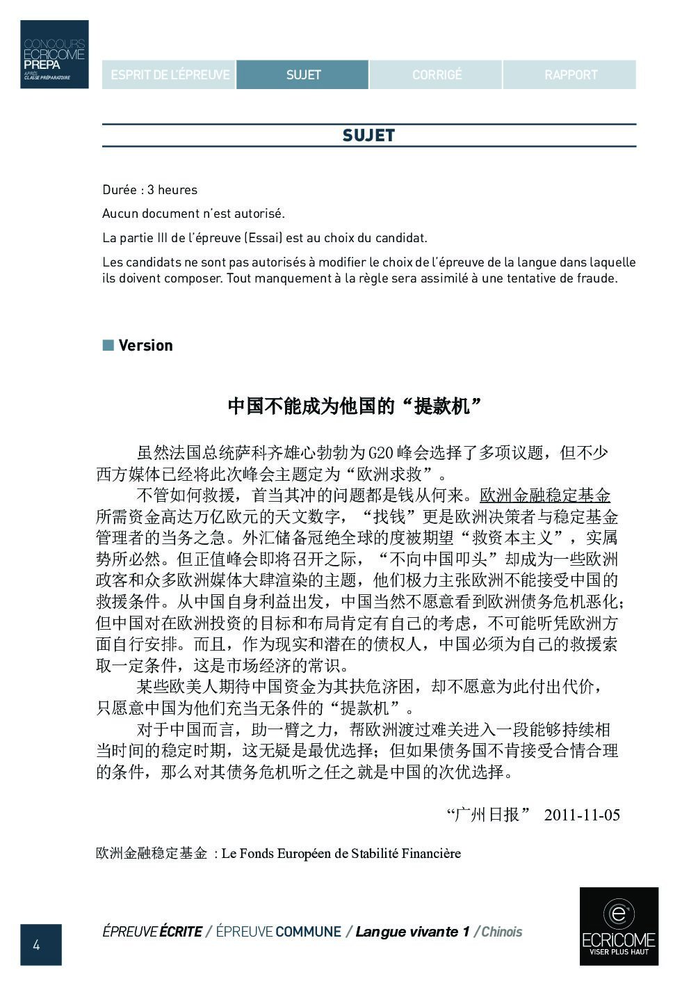 Concours Ecricome Prépa 2012 - Chinois LV1 (Sujet)