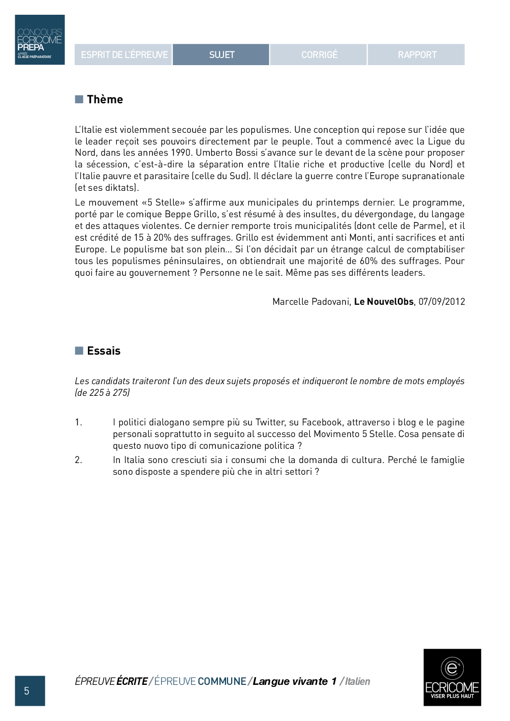 Concours Ecricome Prépa 2013 - Italien LV1 (Sujet)