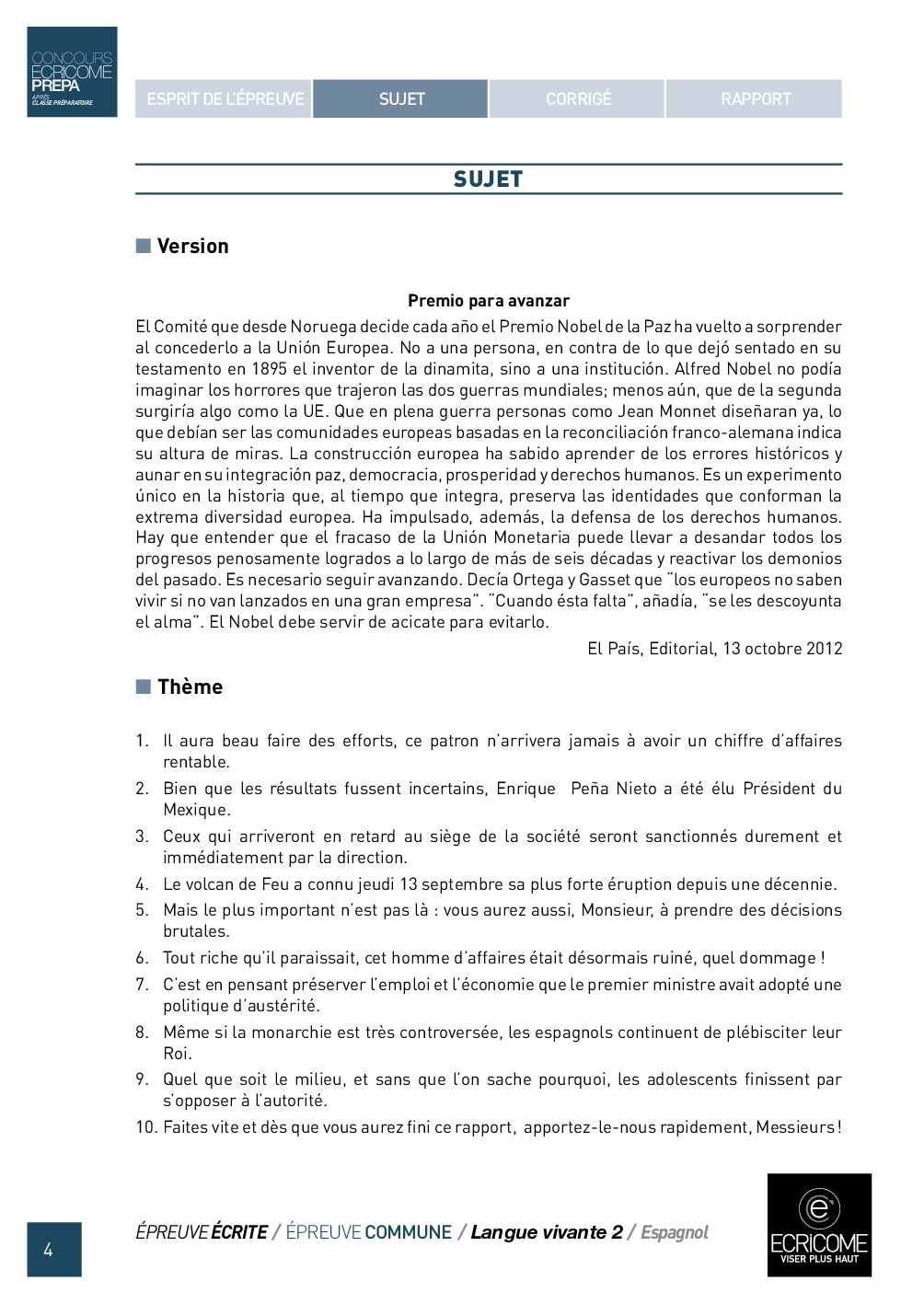 Concours Ecricome Prépa 2013 - Espagnol LV2 (Sujet)