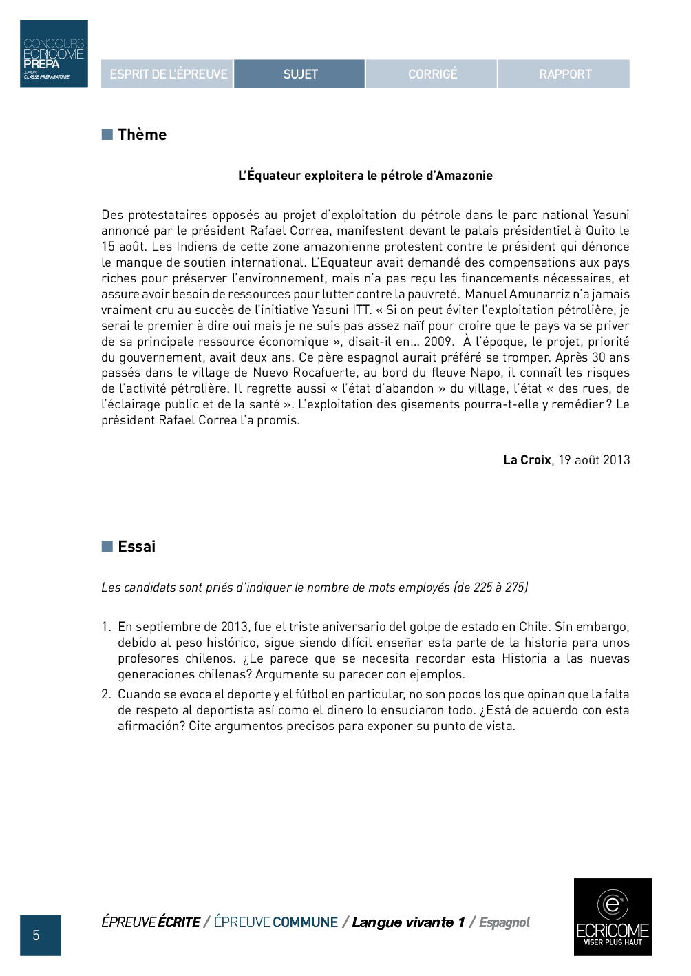 Concours Ecricome Prépa 2014 - Espagnol LV1 (Sujet)