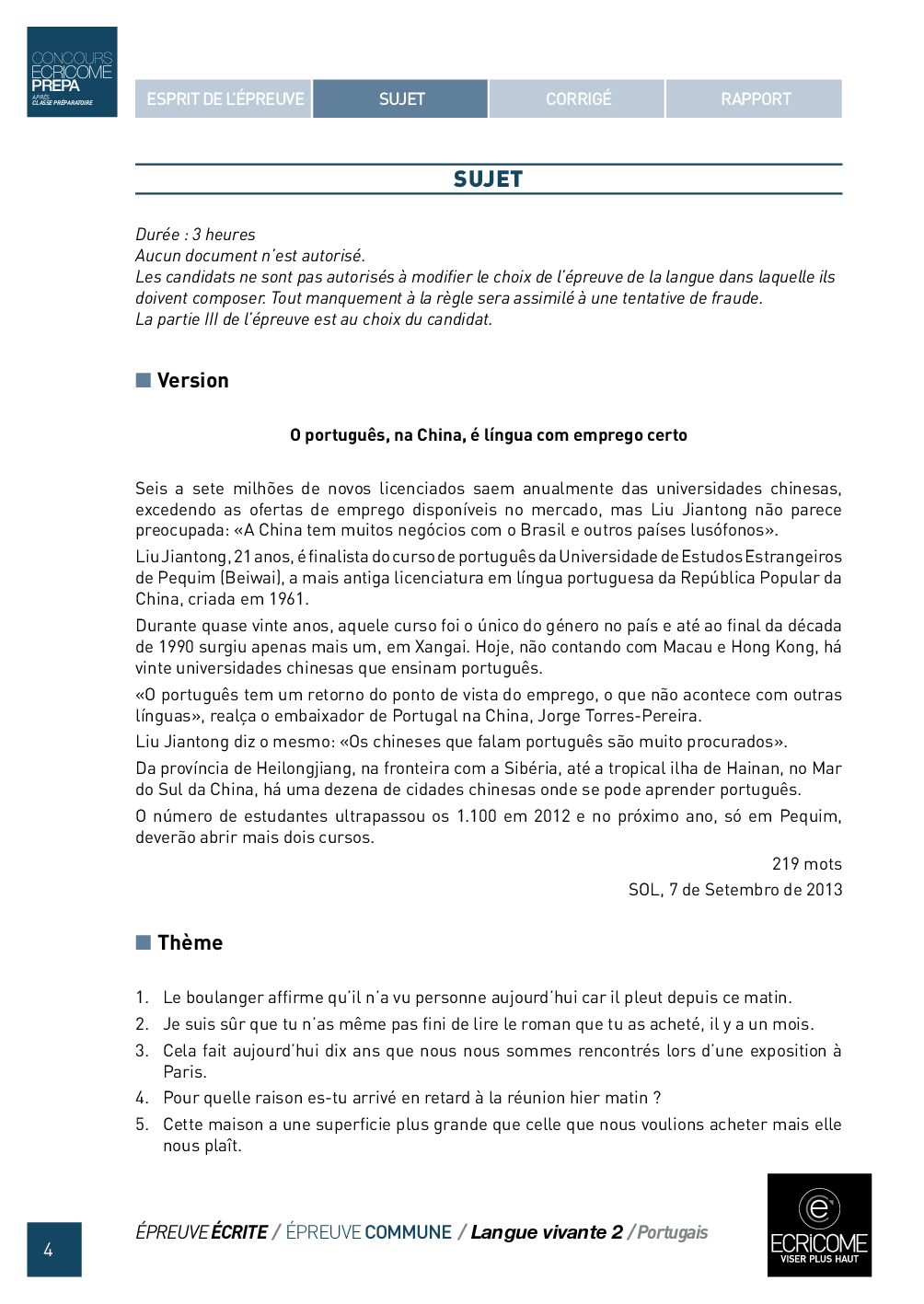 Concours Ecricome Prépa 2014 - Portugais LV2 (Sujet)