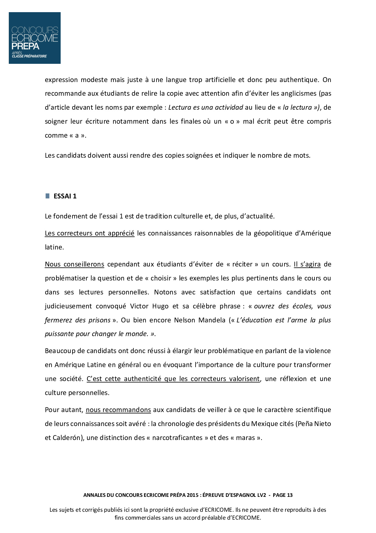 Concours Ecricome Prépa 2015 - Espagnol LV2 (Corrigé)