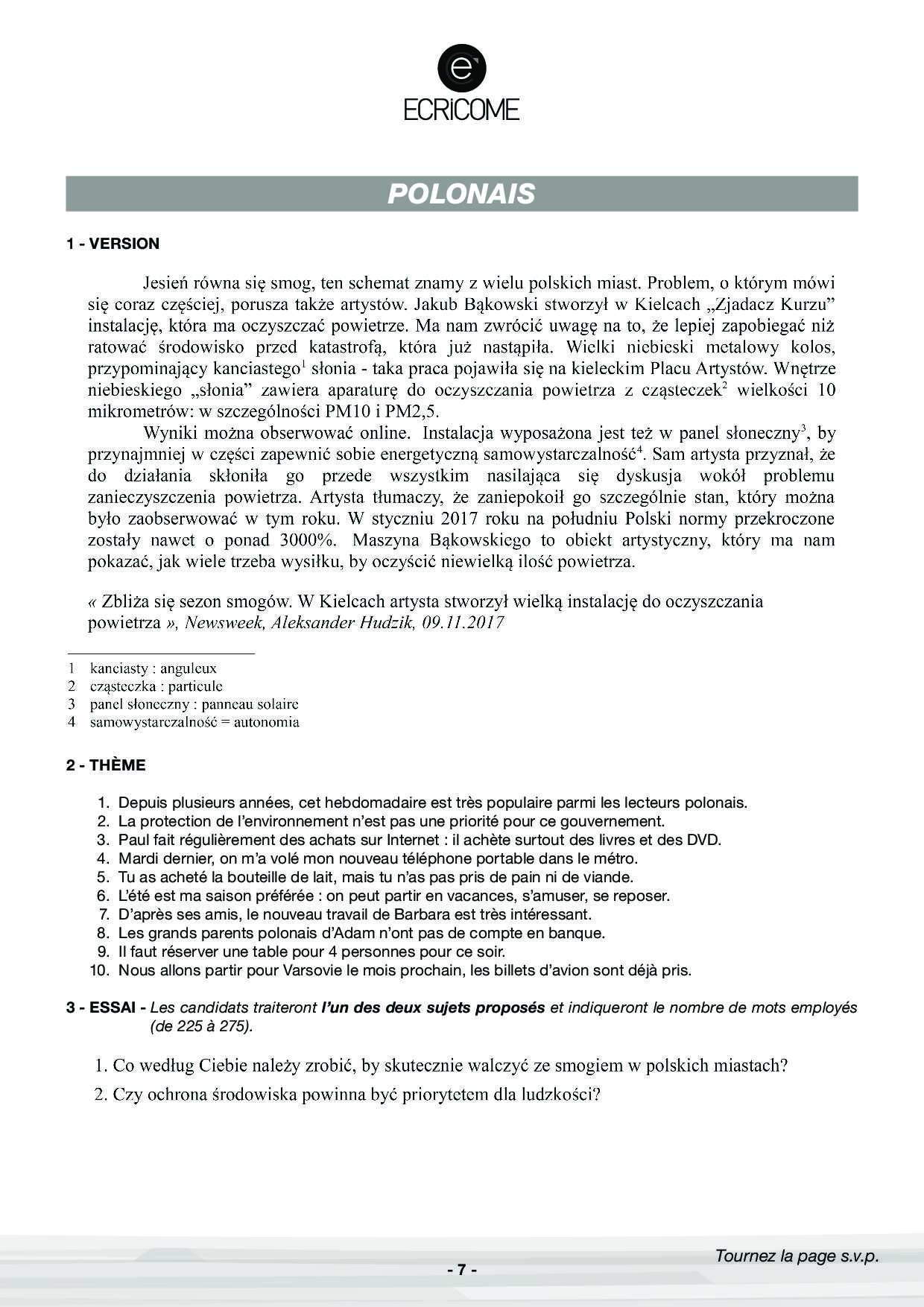 Concours Ecricome Prépa 2018 - Polonais LV2 (Sujet)