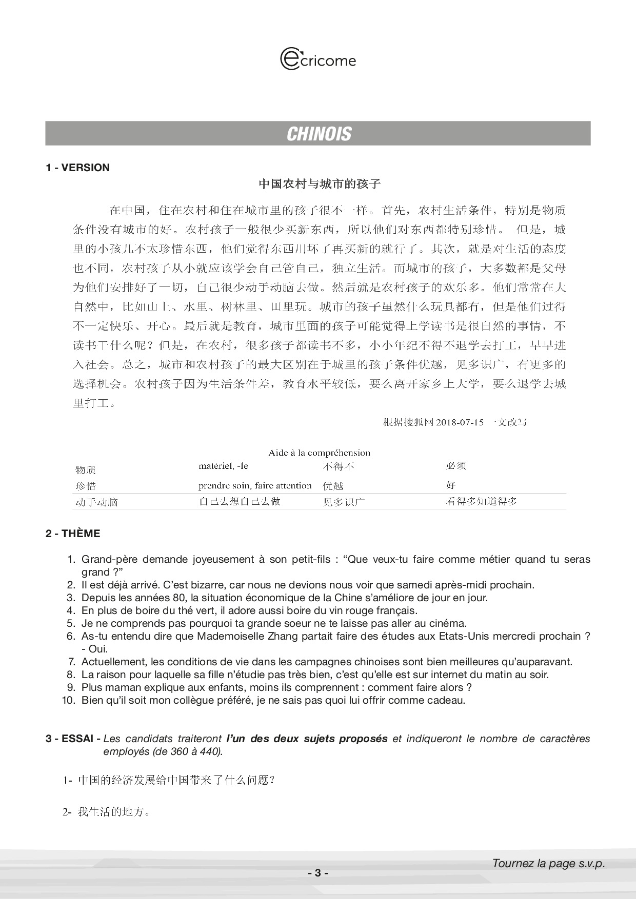 Concours Ecricome Prépa 2019 - Chinois LV2 (Sujet)